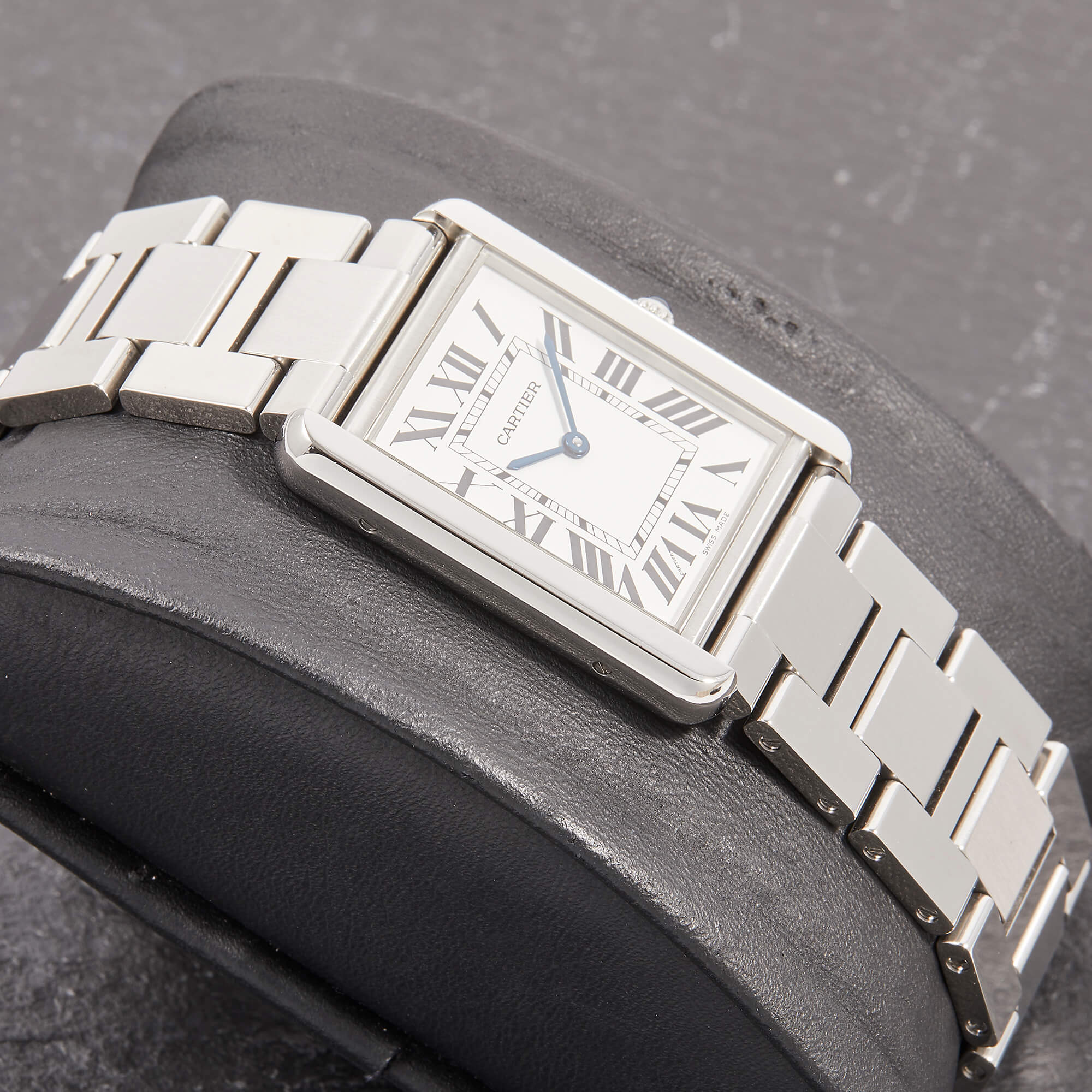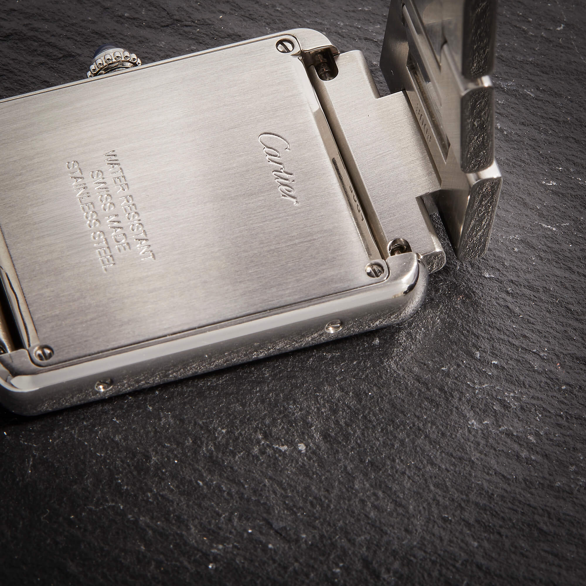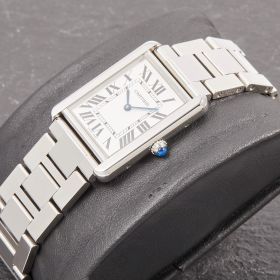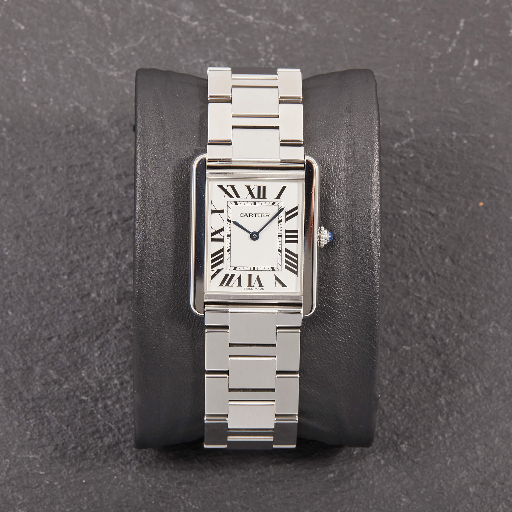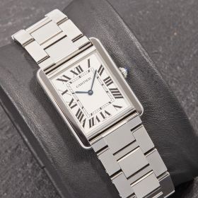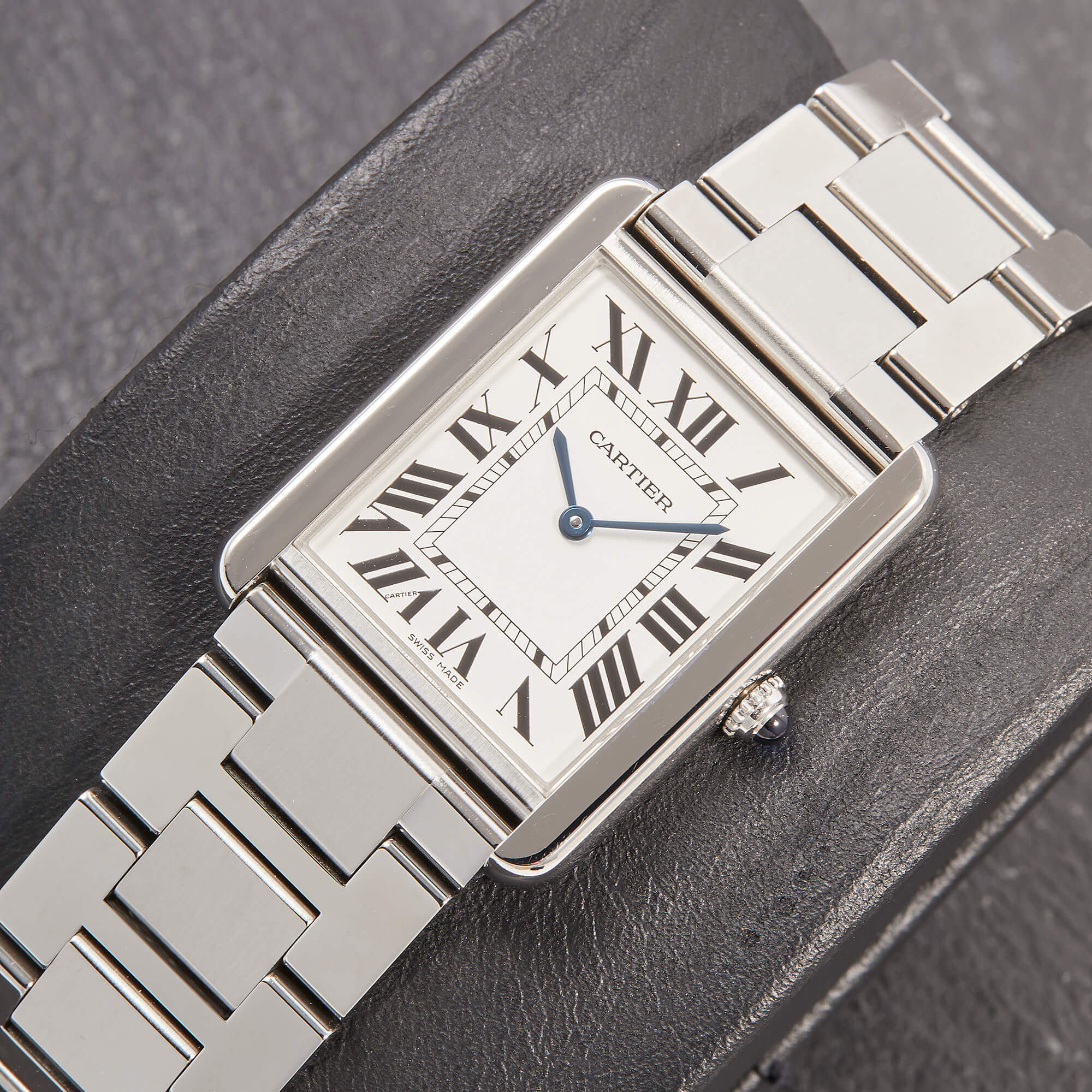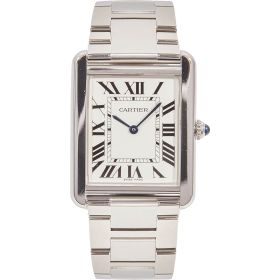 Die Cartier Tank Solo Ref. 3169 steht für zeitlose Eleganz und ikonisches Design. In dieser Variante mit poliertem Edelstahlgehäuse und passendem Stahlband verkörpert sie Understatement und Stil in Perfektion. Das klassische römische Zifferblatt mit blauen Schwertzeigern und die signierte Krone mit Spinell verleihen ihr den typischen Cartier-Charme. Die Uhr befindet sich in schönem, gepflegtem Zustand.- Durchmesser