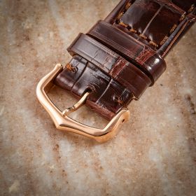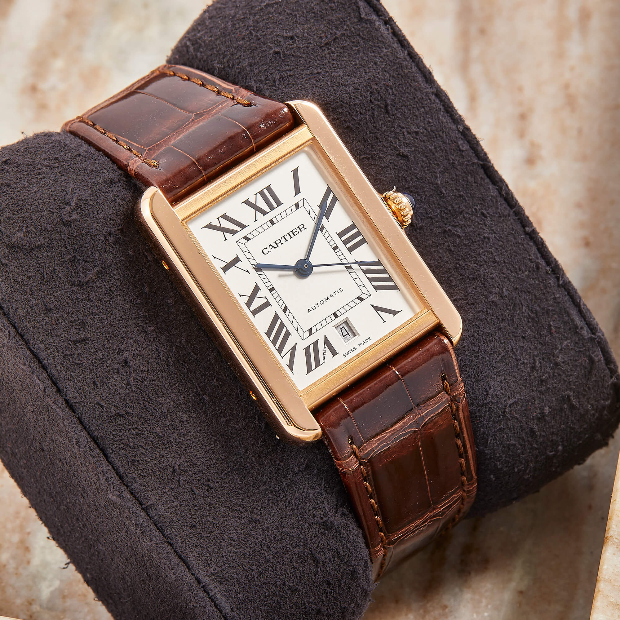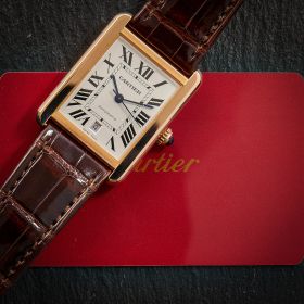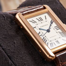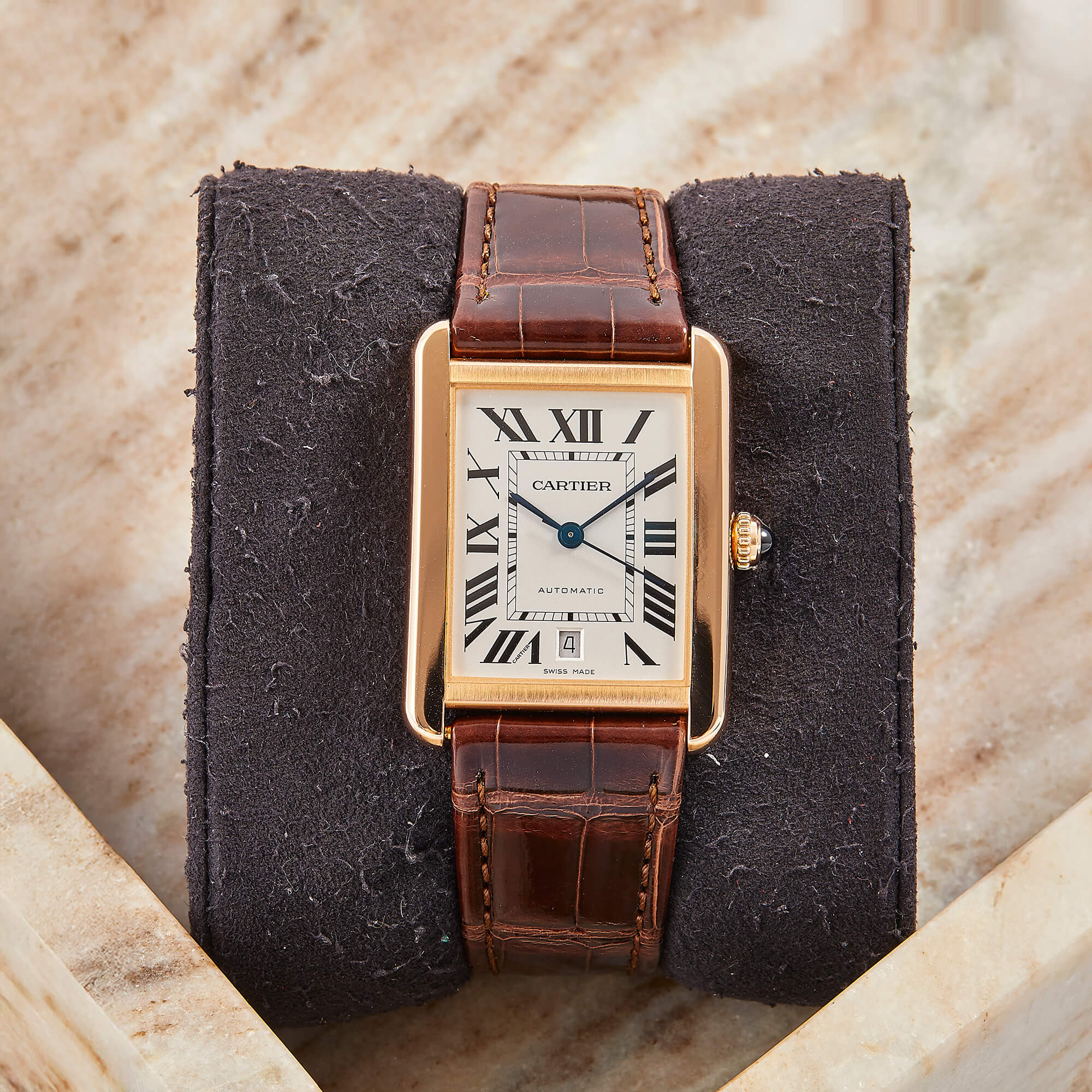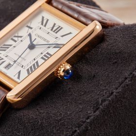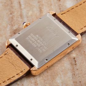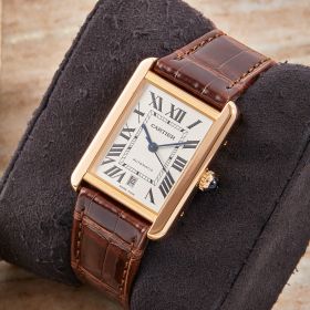 Die Cartier Tank Ref. 3168 besticht durch ihr elegantes Roségoldgehäuse mit den klassischen Abmessungen von 31 mm x 41 mm, die zeitlose Raffinesse verkörpern. Originale Garantiekarte liegt bei.