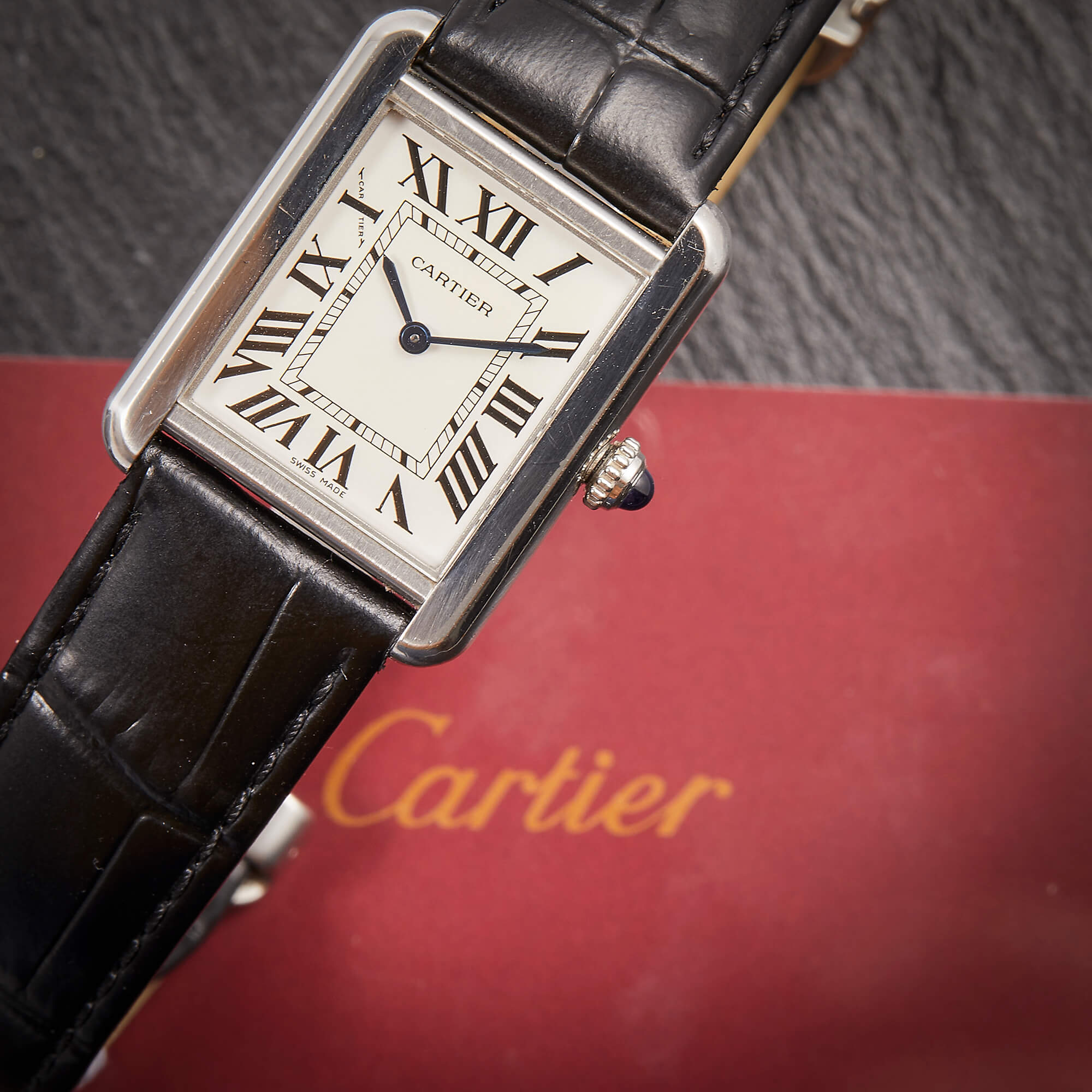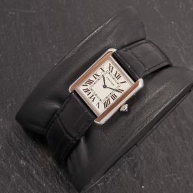 Cartier Tank Solo mit 24 x 31 mm Gehäuseabmessungen. Sie ist komplett in Edelstahl gefertigt und verfügt über originale Garantiepapiere.- Durchmesser