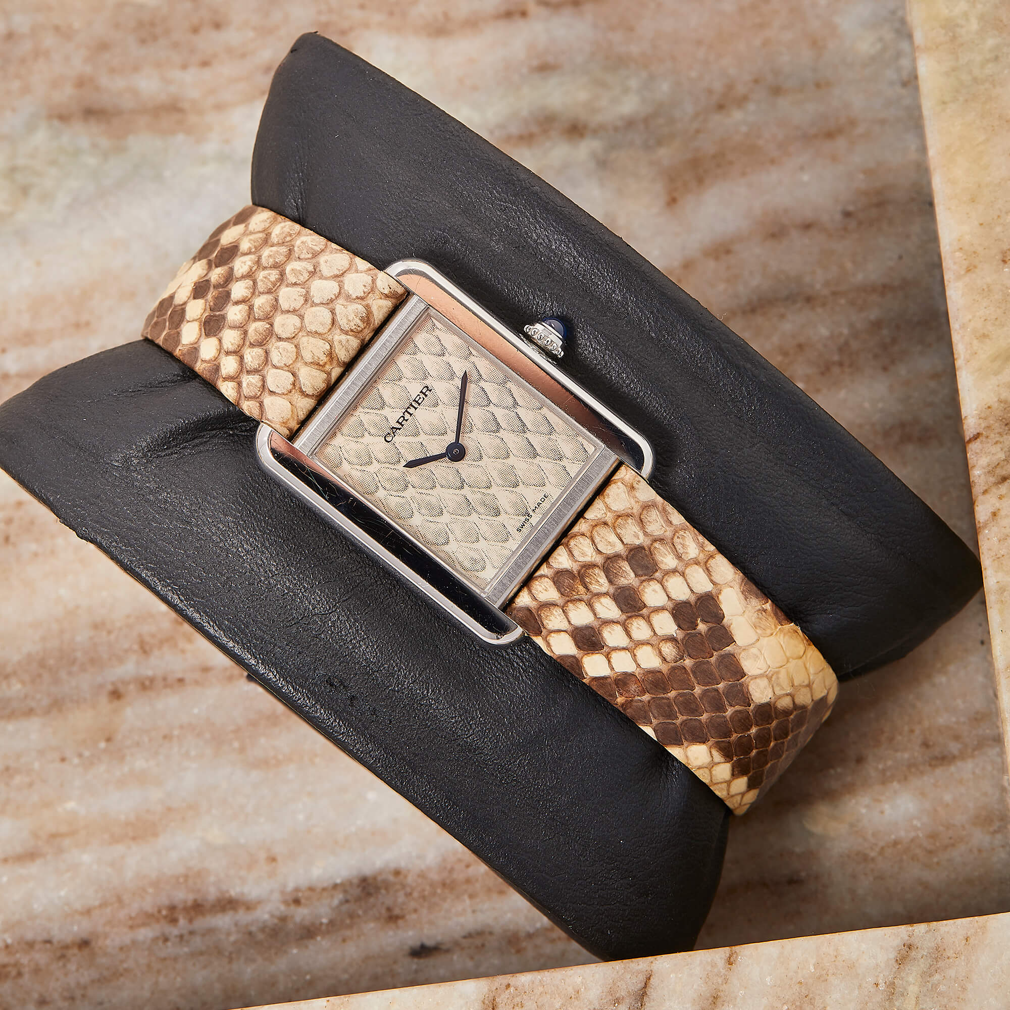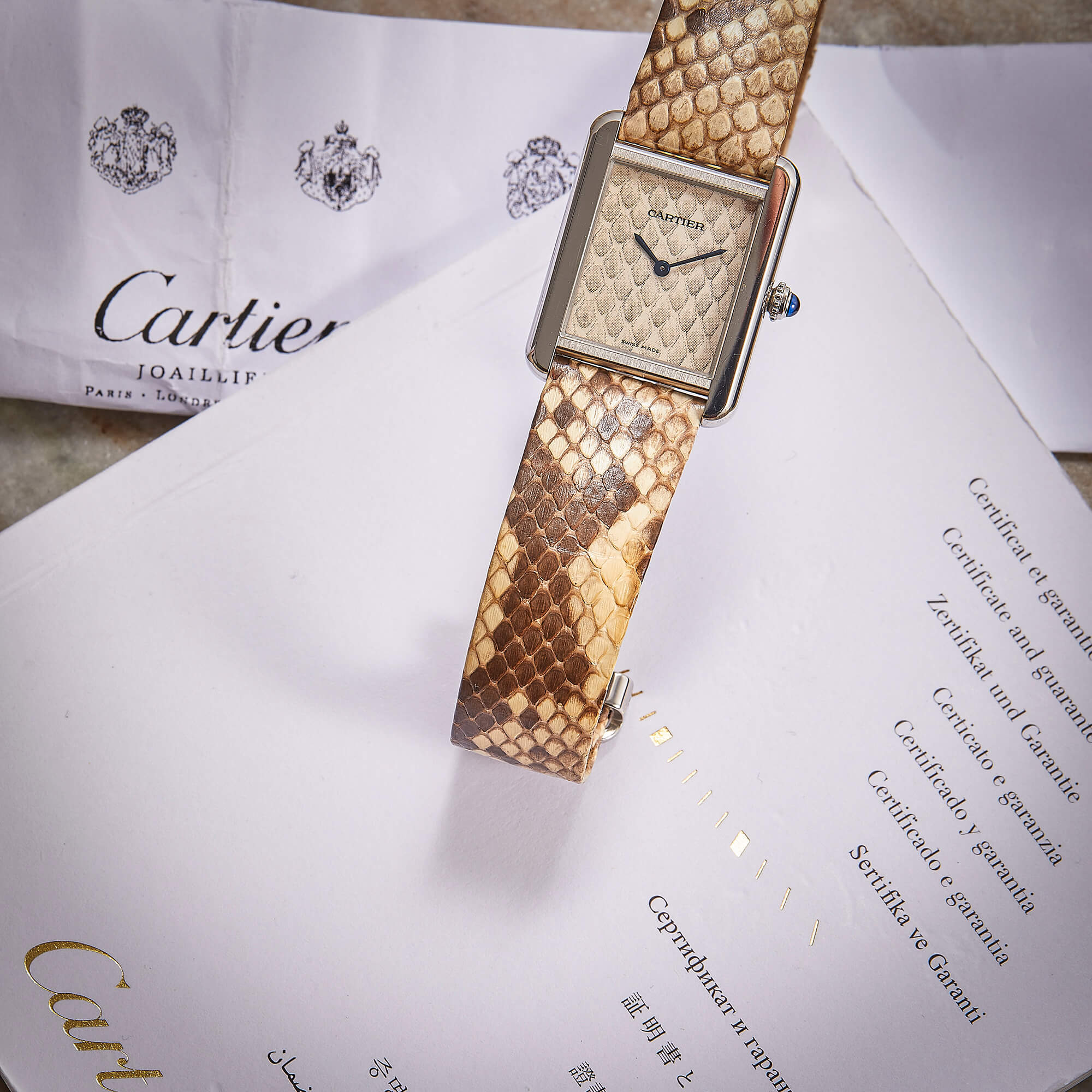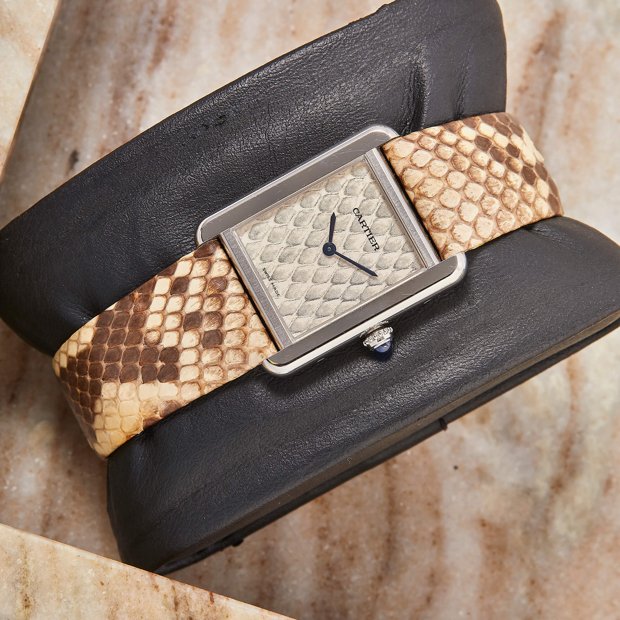 Die Cartier Tank Solo Ref. 3170 steht für zeitlose Eleganz und ikonisches Design. In dieser Variante mit poliertem Edelstahlgehäuse und Lederband und Zifferblatt in Pythonoptik strahlt sie Individualismus aus. Die Uhr befindet sich in schönem, gepflegtem Zustand und kommt mit originaler Garantiekarte, sowie frischem Service im Juli 2025.- Durchmesser