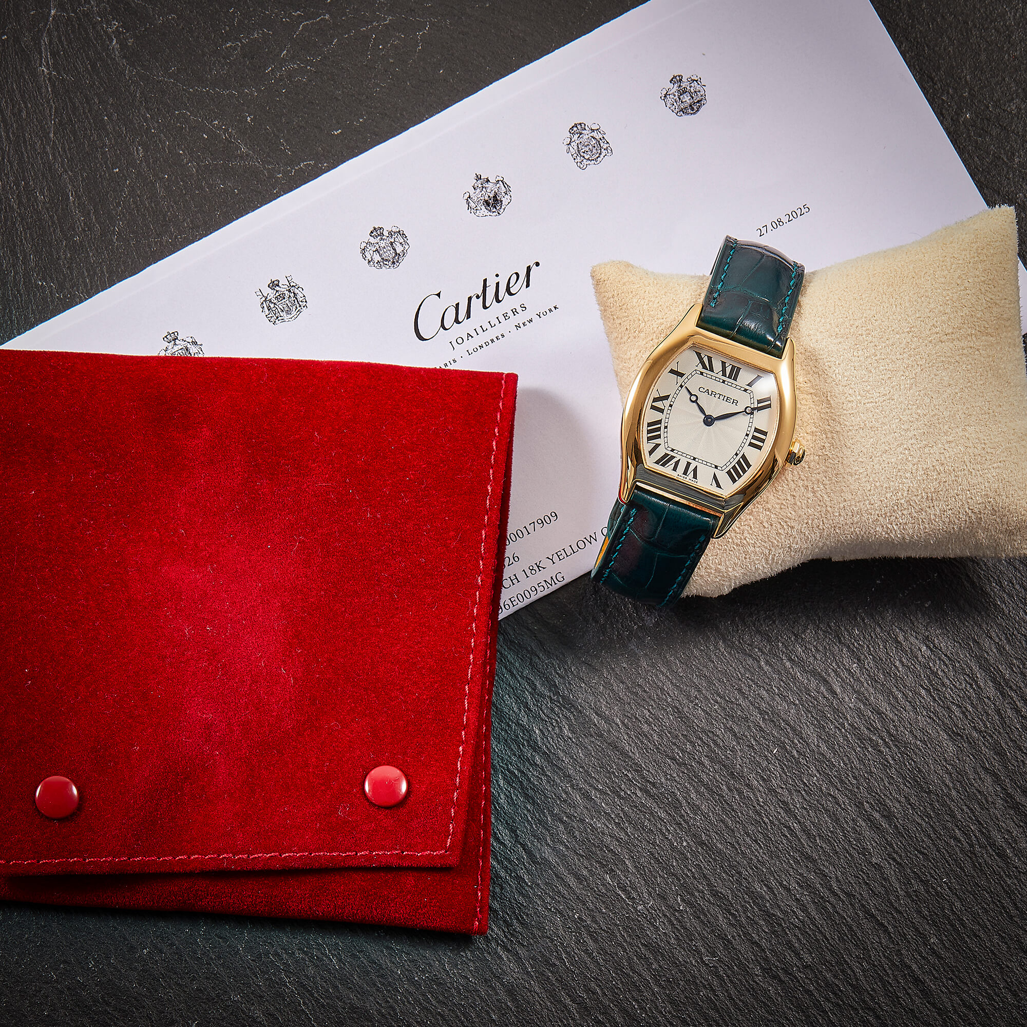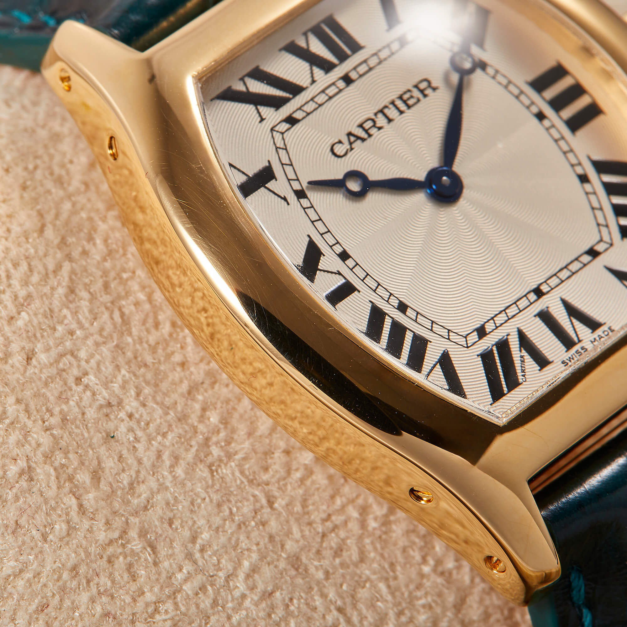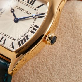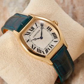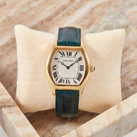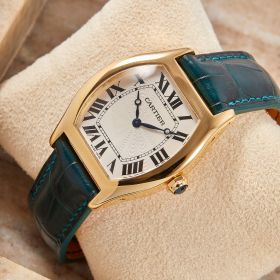 Cartier Tortue, Referenz 2496E, mit mechanischem Werk im edlen Gelbgoldgehäuse. Dieses Modell besticht durch seine charakteristische Gehäuseform, die seit jeher zu den Ikonen der Cartier-Uhrmacherkunst zählt. Ergänzt wird die Uhr durch ein grünes Lederband mit passender Faltschließe, das dem Klassiker eine frische und zugleich elegante Note verleiht. Ein zeitloses Schmuckstück, das Eleganz, Tradition und feine Uhrmacherkunst auf ideale Weise vereint. Inkl. frischer Revision beim Hersteller.