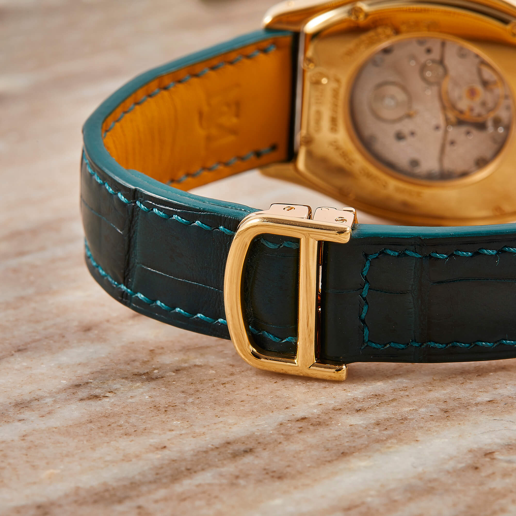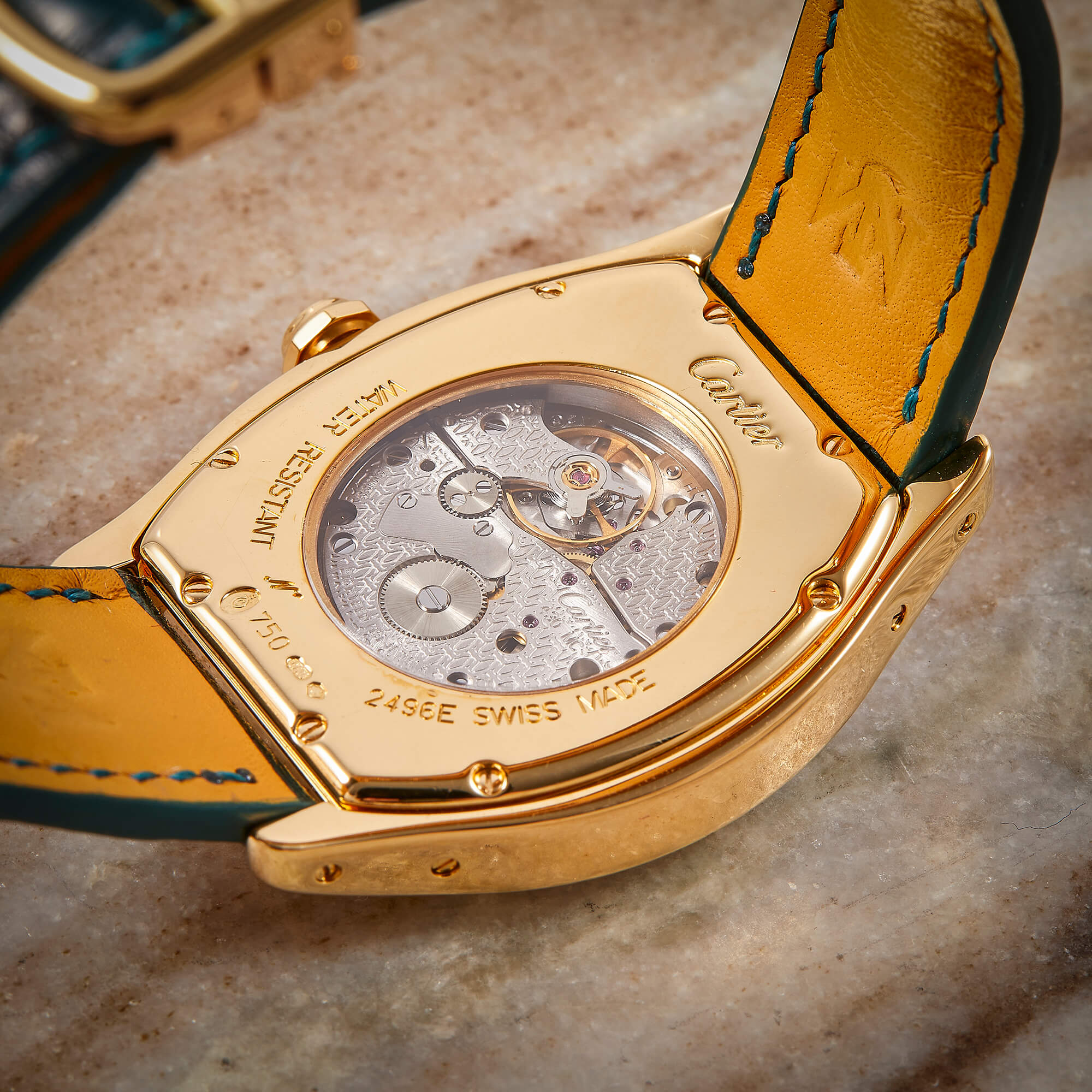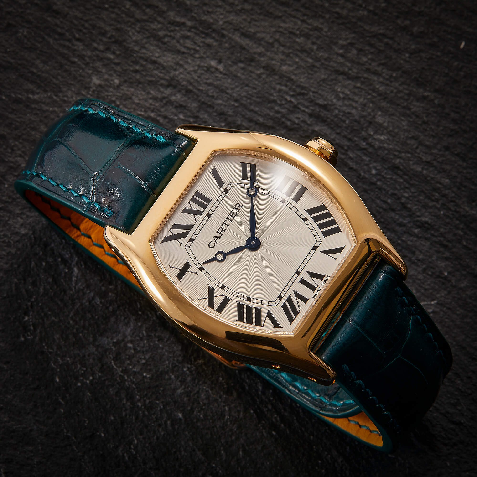 Cartier Tortue, Referenz 2496E, mit mechanischem Werk im edlen Gelbgoldgehäuse. Dieses Modell besticht durch seine charakteristische Gehäuseform, die seit jeher zu den Ikonen der Cartier-Uhrmacherkunst zählt. Ergänzt wird die Uhr durch ein grünes Lederband mit passender Faltschließe, das dem Klassiker eine frische und zugleich elegante Note verleiht. Ein zeitloses Schmuckstück, das Eleganz, Tradition und feine Uhrmacherkunst auf ideale Weise vereint. Inkl. frischer Revision beim Hersteller.