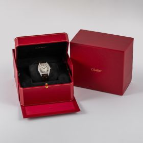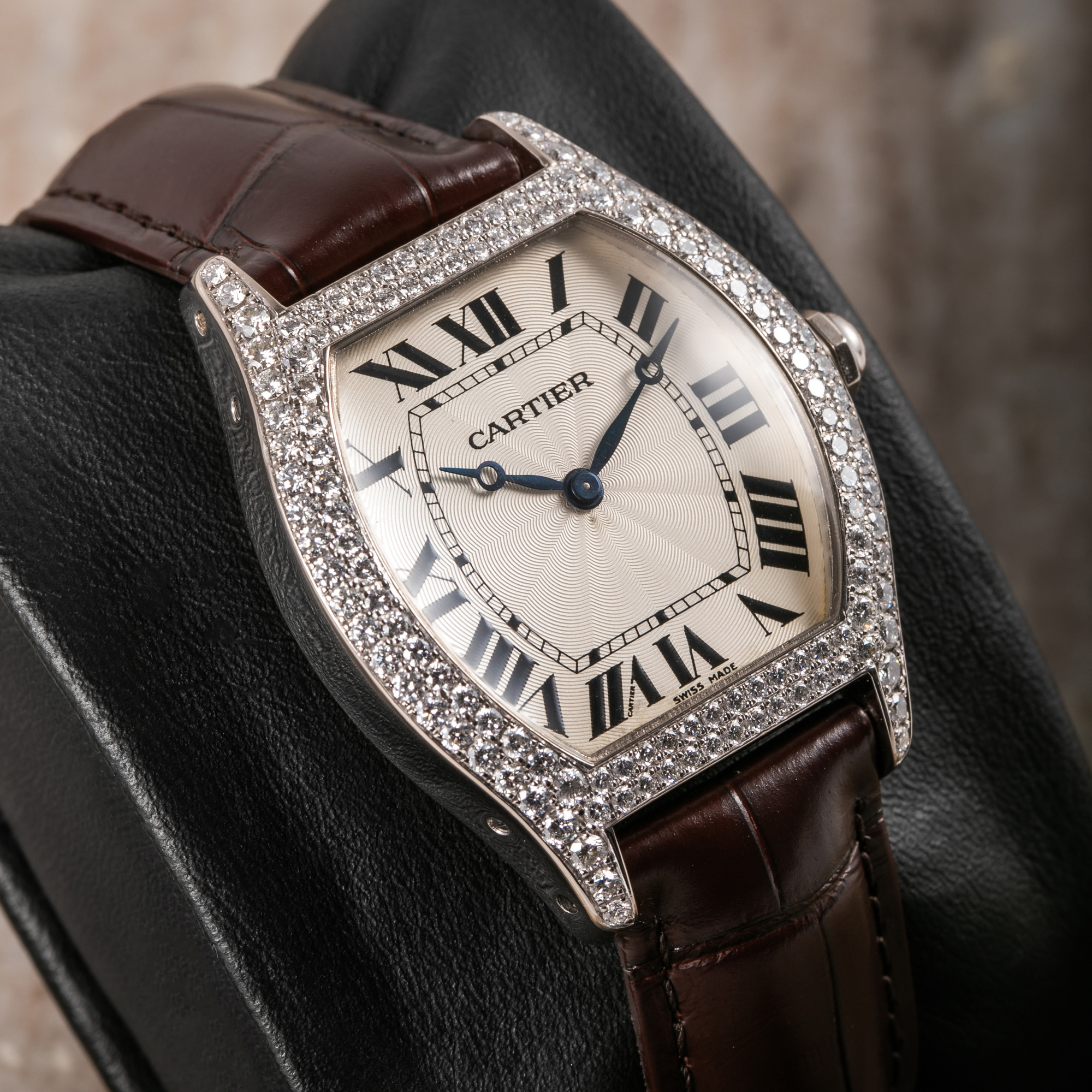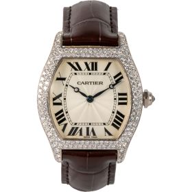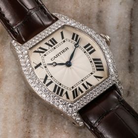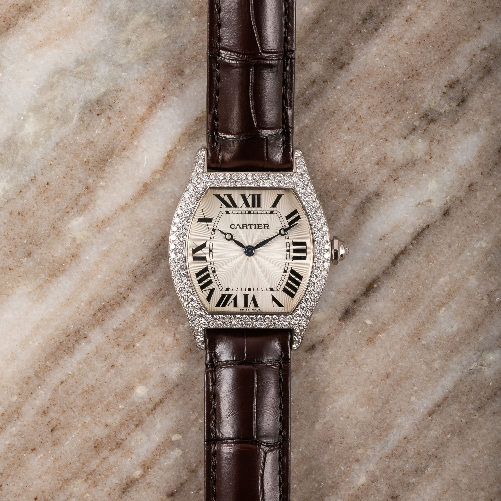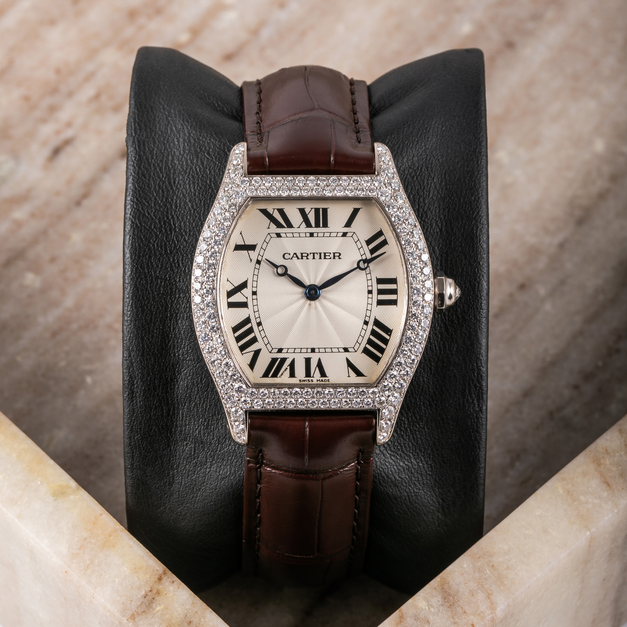 Die Cartier Tortue 2497 ist eine elegante Weißgolduhr, die durch ihren klassischen Charme und das markante, geschwungene Gehäuse besticht. Dieses Modell ist mit einem facettierten Diamantbesatz versehen, der direkt aus der Cartier-Manufaktur stammt und der Uhr einen luxuriösen Glanz verleiht. Die Uhr befindet sich in einem sehr schönen Zustand und kommt mit der originalen Cartier-Box.