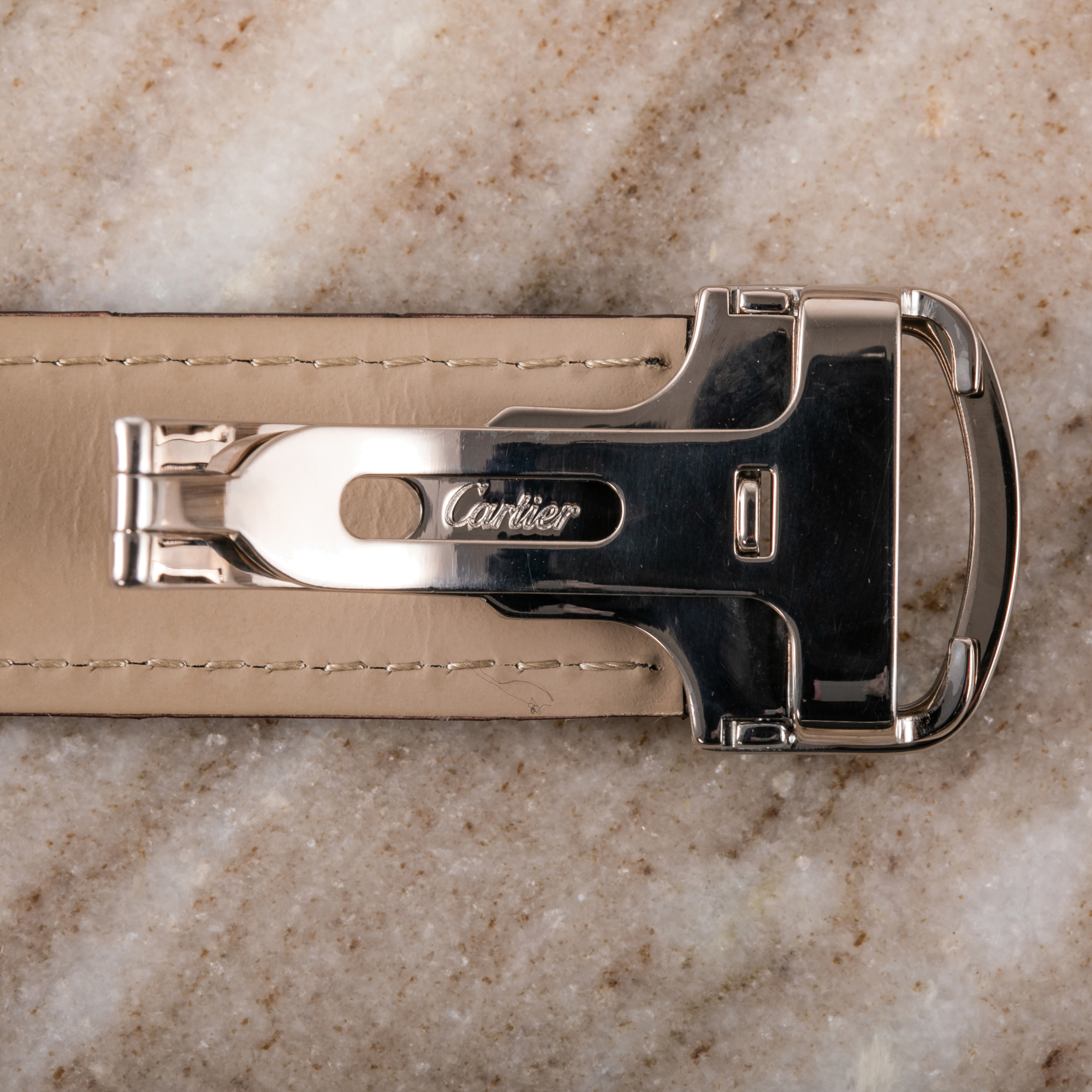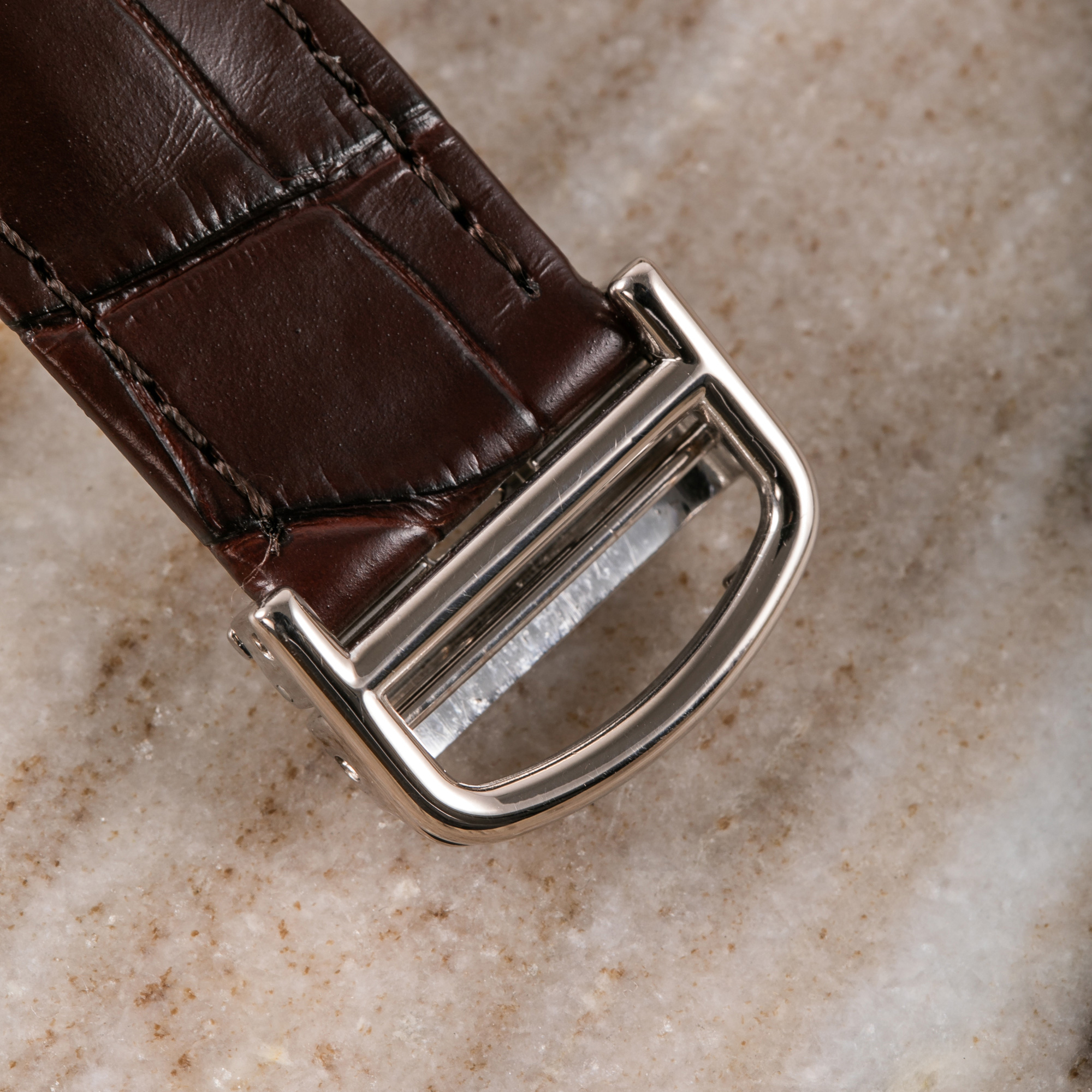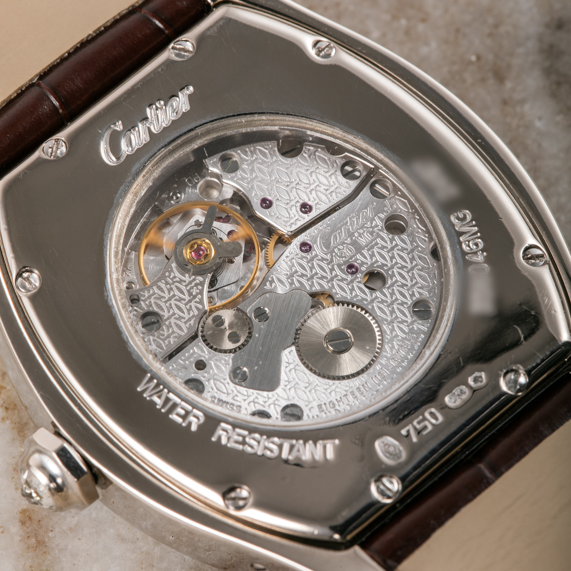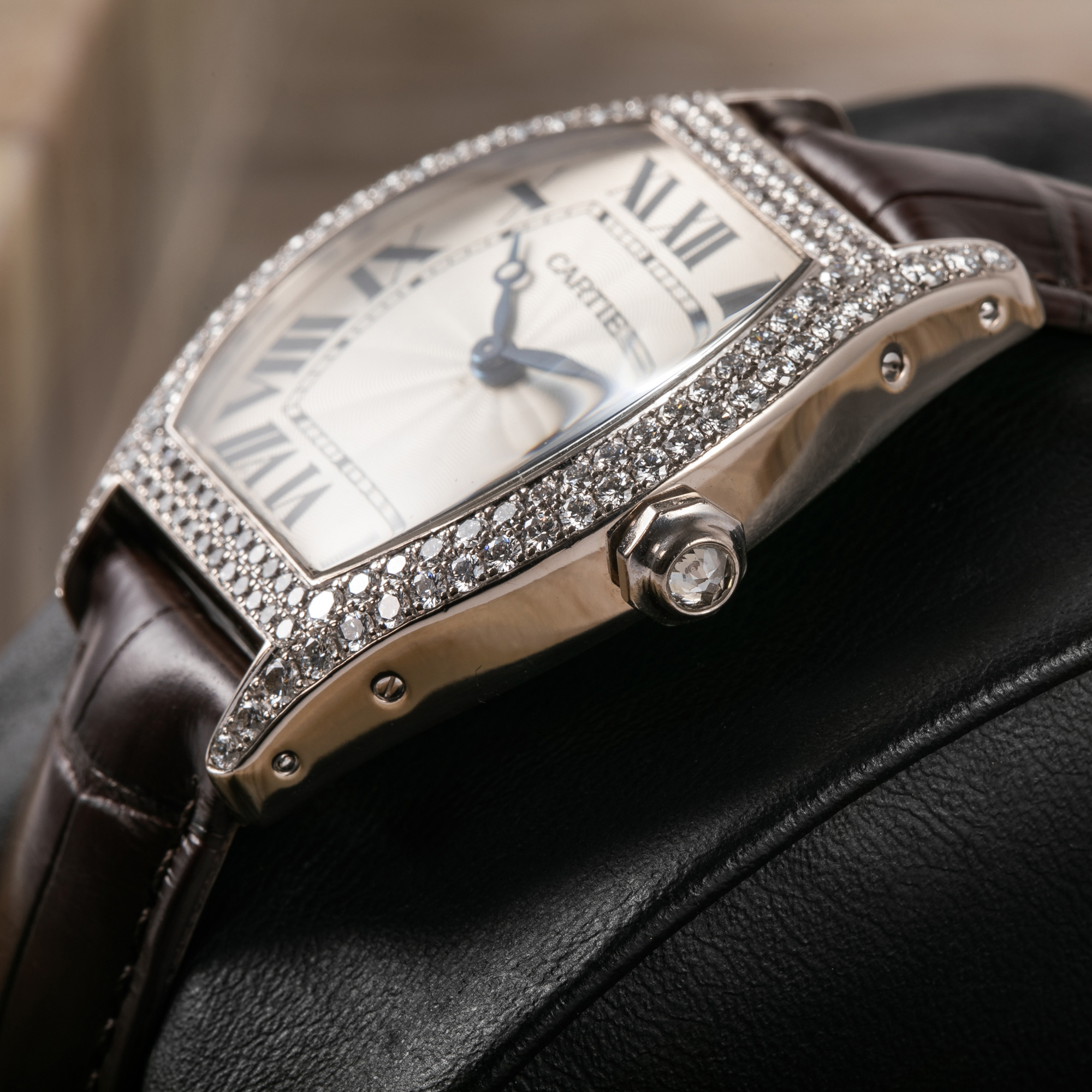 Die Cartier Tortue 2497 ist eine elegante Weißgolduhr, die durch ihren klassischen Charme und das markante, geschwungene Gehäuse besticht. Dieses Modell ist mit einem facettierten Diamantbesatz versehen, der direkt aus der Cartier-Manufaktur stammt und der Uhr einen luxuriösen Glanz verleiht. Die Uhr befindet sich in einem sehr schönen Zustand und kommt mit der originalen Cartier-Box.
