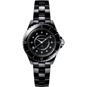 CHANEL J12 Classic - Schwarze extrem widerstandsfähige Keramik und Gehäuse aus Edelstahl, Einseitig drehbare Lünette, Schwarz lackiertes Zifferblatt mit 12 Diamantindizes (~0,06 Karat), Armband aus schwarzer extrem widerstandsfähiger Keramik und Dreifachfaltschließe aus Edelstahl, Verschraubte Krone aus Edelstahl mit einem Cabochon aus schwarzer extrem widerstandsfähiger Keramik, Hochpräzisions-Quarzuhrwerk, Wasserdichtigkeit: 200 m, Durchmesser 33 mmProduktspezifikationen