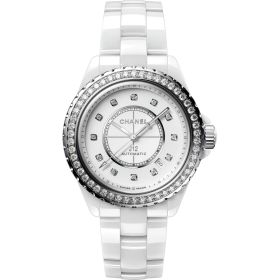 CHANEL J12 KALIBER 12.1 DIAMANTLÜNETTE, Gehäuse aus weißer extrem widerstandsfähiger Keramik und Edelstahl, Gehäuseboden aus Saphirglas, feststehende Lünette aus Edelstahl besetzt mit 50 Diamanten im Brillantschliff (ca. 1,51 ct.), weiß lackiertes Zifferblatt mit 12 Diamantindizes (ca. 0,09 ct.), Armband aus weißer extrem widerstandsfähiger Keramik und Edelstahl, Dreifachfaltschließe aus Edelstahl, nicht verschraubte Krone aus Edelstahl mit einem Cabochon aus weißer extrem widerstandsfähiger Keramik, Kaliber 12.1: mechanisches Manufakturwerk mit Automatikaufzug, COSC-zertifiziert, Funktionen: Stunden, Minuten, Sekunden, Datum, Gangreserve: ca. 70 Std., Garantie: 5 Jahre, Wasserdichtigkeit bis 50 m, Durchmesser 38 mmProduktspezifikationen