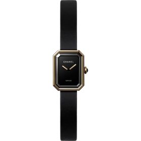 Chanel Première Velours Damenuhr aus Gelbgold, Titan und Kautschuk. Schwarz lackiertes Zifferblatt. Krone aus 18 Karat Gelbgold mit einem Onyx-Cabochon. Gehäuseboden aus Titan. Armband aus samtweichem, schwarzem Kautschuk mit Dornschließe aus Gelbgold. Hochpräzises Quarzwerk.Produktspezifikationen