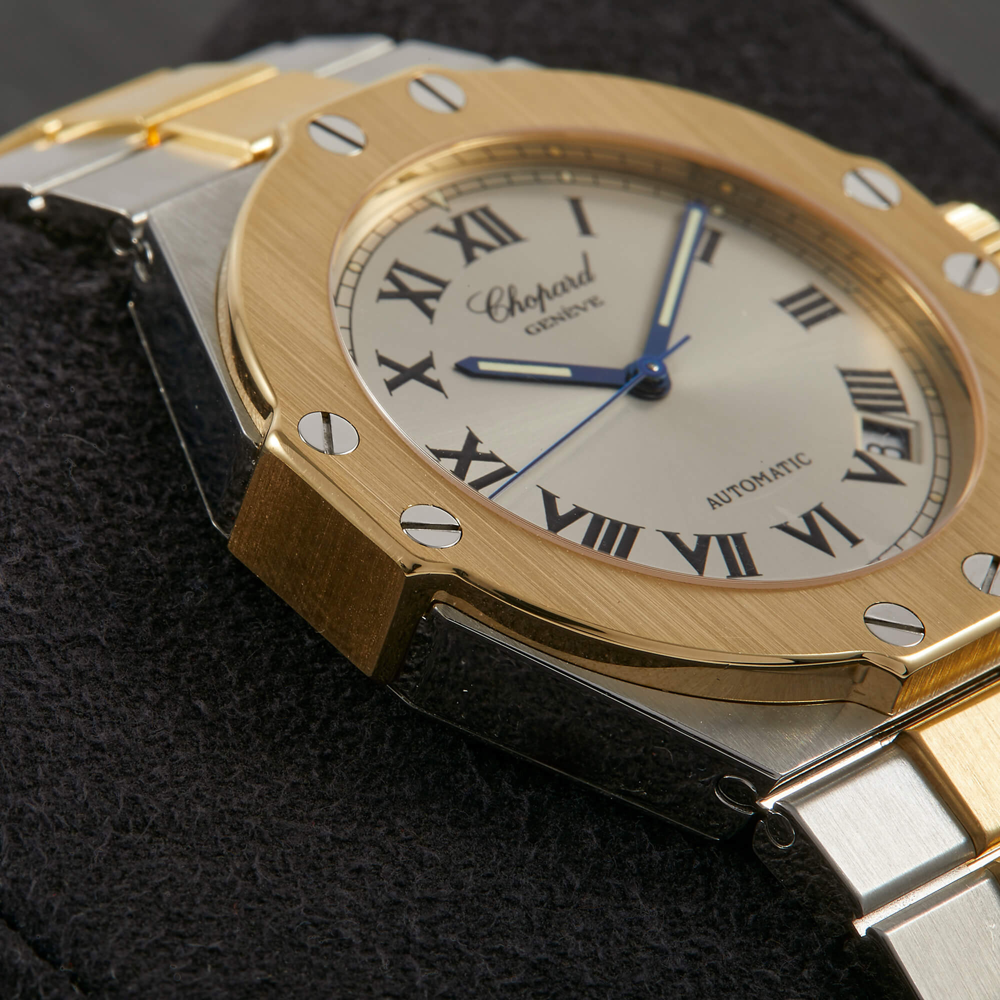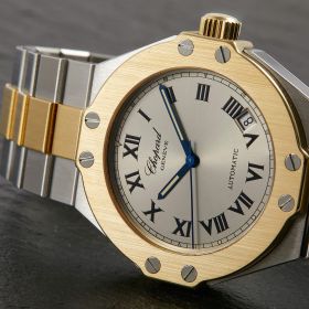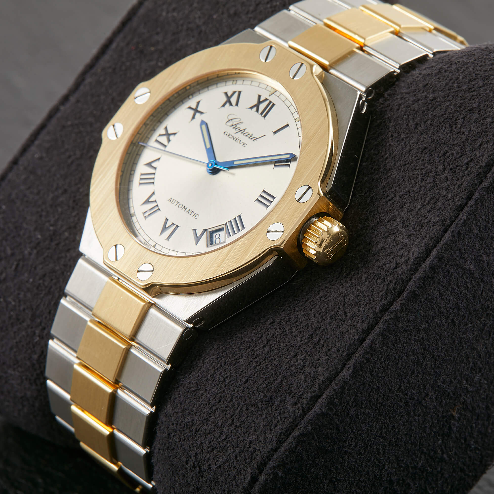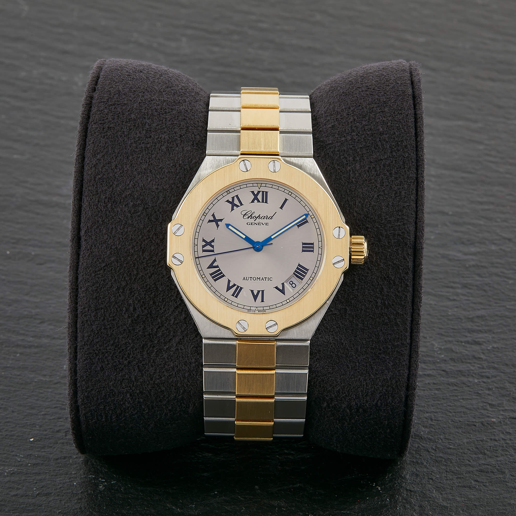 Die Chopard St. Moritz Ref. 8300 präsentiert sich in einer edlen Stahl-Gelbgold-Ausführung mit markanter Schraubenlünette und integriertem Band. Das graue Zifferblatt mit römischen Indizes und gebläuten Zeigern verleiht der Uhr eine elegante Tiefe und klassischen Charakter. Ein seltener Fund in diesem Zustand – inklusive Box und Papieren. Ein stilvoller Zeitzeuge der frühen 2000er Jahre mit sportlich-eleganter Ausstrahlung.