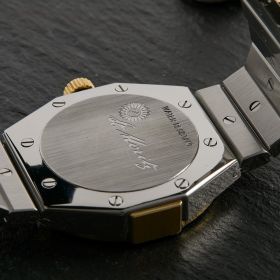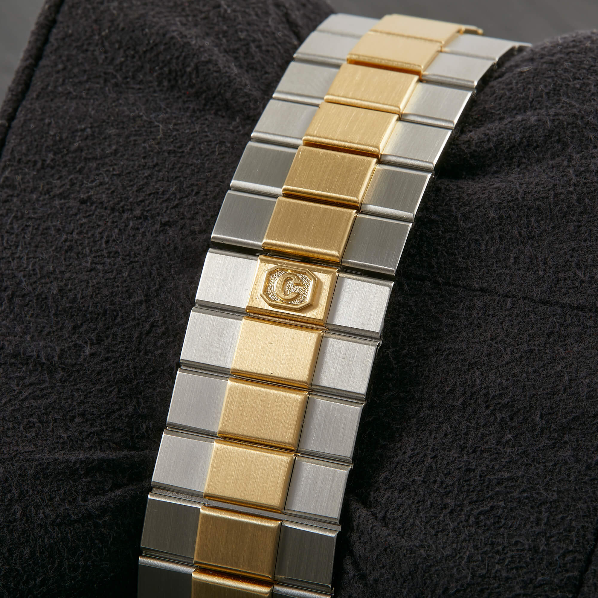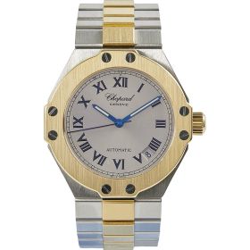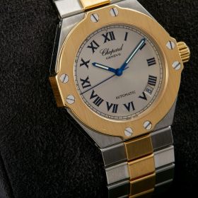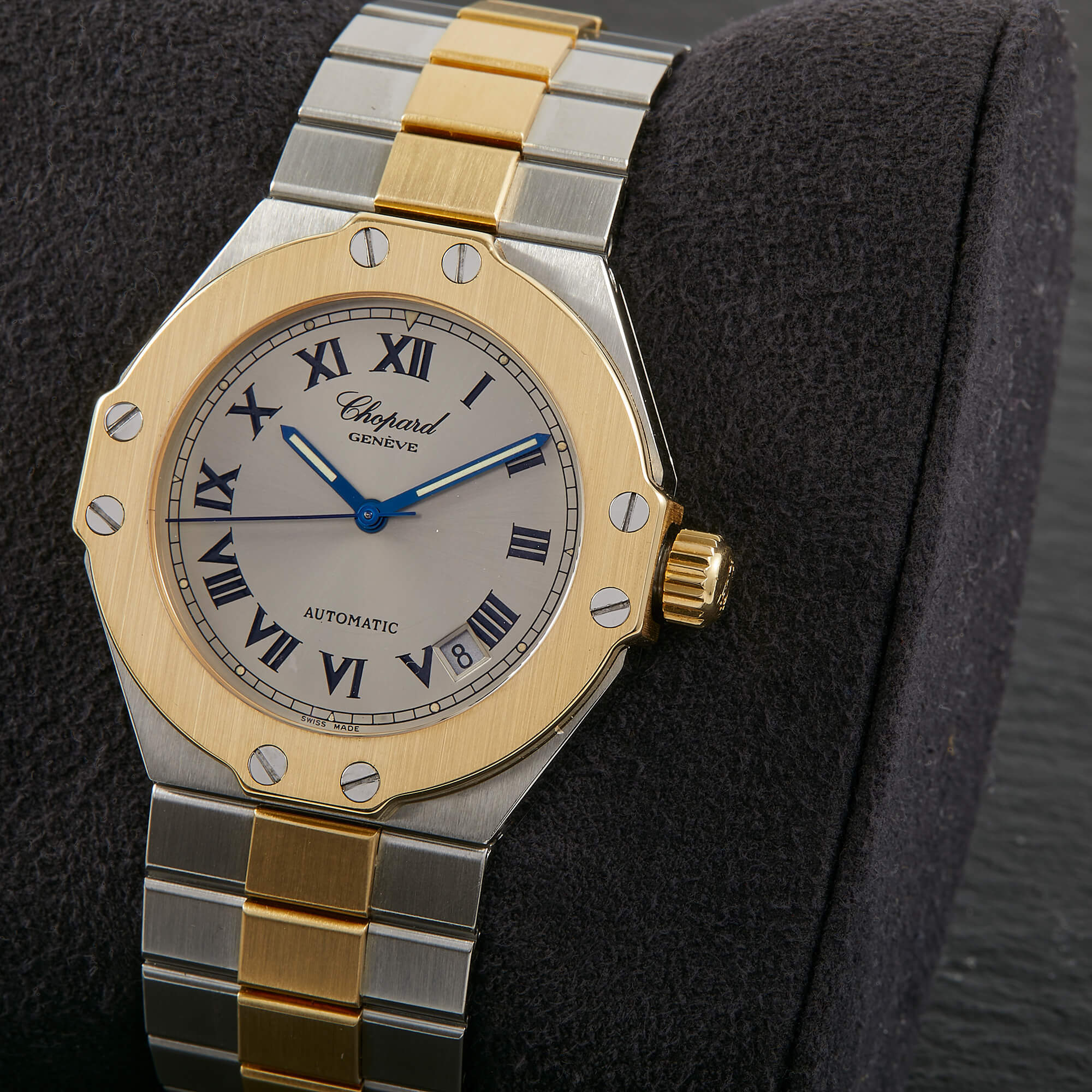 Die Chopard St. Moritz Ref. 8300 präsentiert sich in einer edlen Stahl-Gelbgold-Ausführung mit markanter Schraubenlünette und integriertem Band. Das graue Zifferblatt mit römischen Indizes und gebläuten Zeigern verleiht der Uhr eine elegante Tiefe und klassischen Charakter. Ein seltener Fund in diesem Zustand – inklusive Box und Papieren. Ein stilvoller Zeitzeuge der frühen 2000er Jahre mit sportlich-eleganter Ausstrahlung.