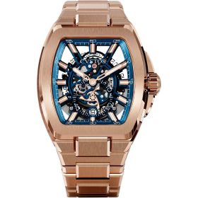 Mit einem Gehäuse und Band aus 750/- Roségold ist dieses Modell ein echtes Highlight. Seine schlichte Eleganz wird durch das Zusammenspiel von polierten und satinierten Oberflächen unterstrichen, die die Dynamik des Metropolitan-Gehäuses betonen. Die Version mit offenem Zifferblatt enthüllt ein hochmodernes, superskelettiertes Uhrwerk mit Automatikaufzug.Produktspezifikationen