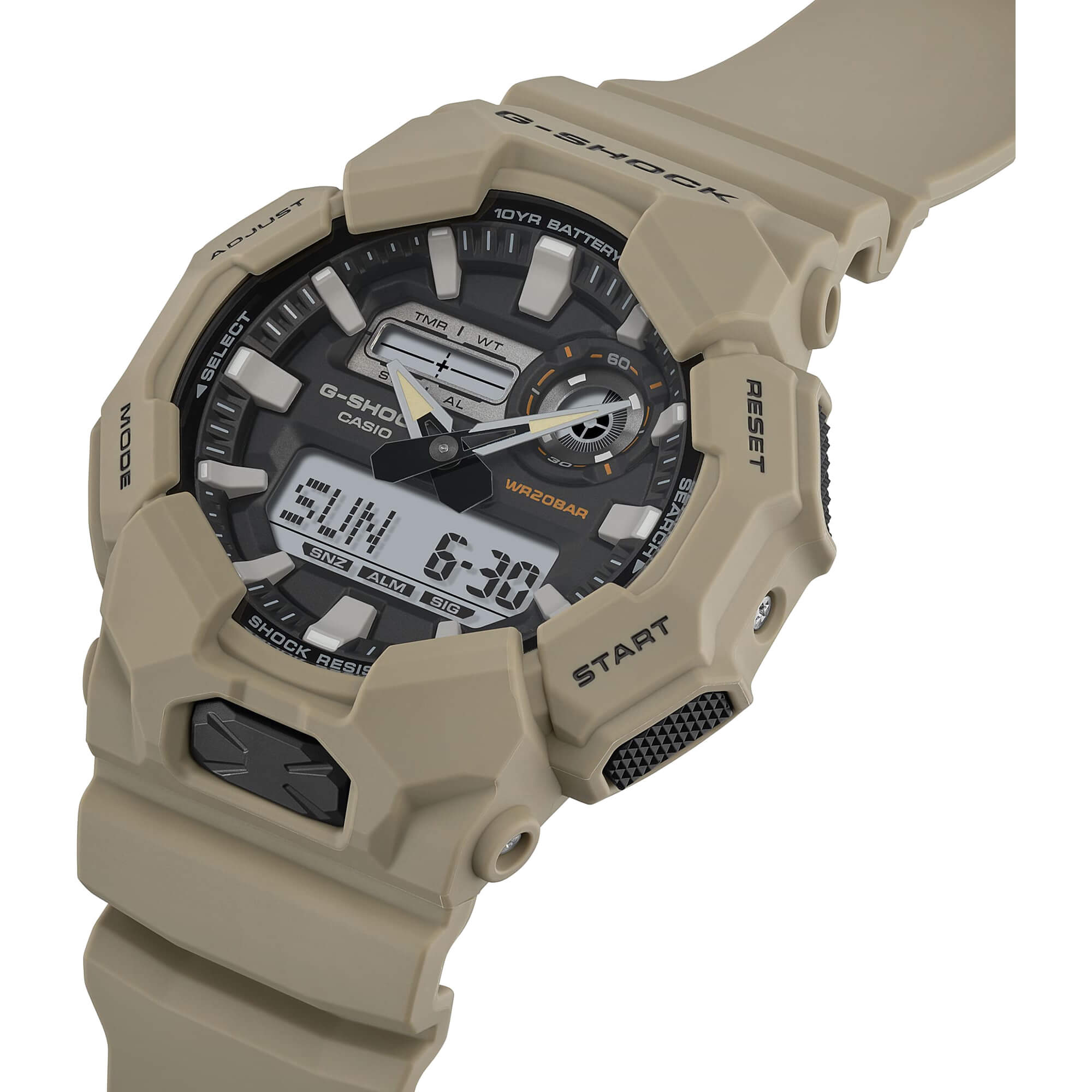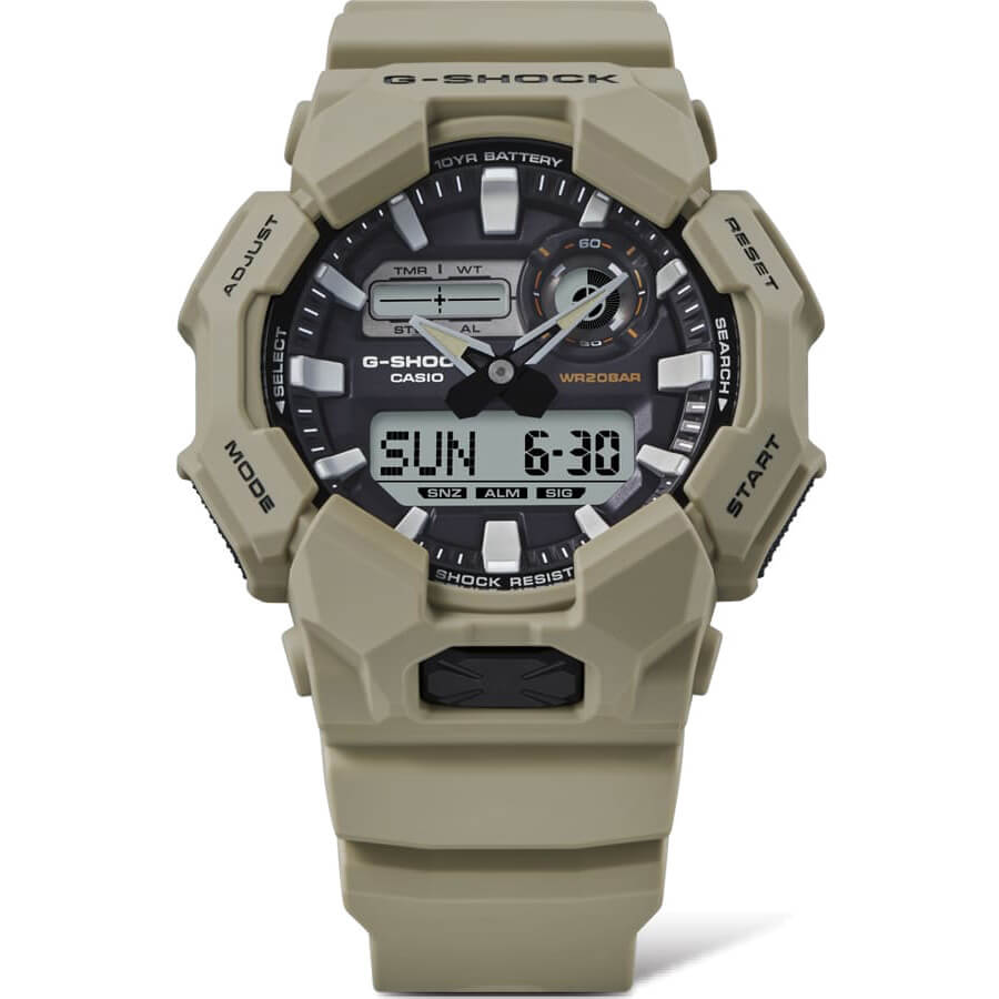Mit der GA-010 Uhr müssen Sie sich kaum Gedanken machen. Dank des robusten G-SHOCK Gehäuses und einer Batterielaufzeit von bis zu 10 Jahren ist sie ein zuverlässiger Begleiter. Dieser analog-digitale Zeitmesser bietet praktische Funktionen wie Weltzeit und Stoppuhr sowie eine helle LED-Beleuchtung, die über die große Taste an der Gehäusevorderseite leicht zugänglich ist. So ist die Ablesbarkeit auch im Dunkeln garantiert. Das Gehäuse besteht aus biobasiertem Resin, ideal, wenn Sie die Umweltbelastung reduzieren möchten. Die Serie ist in verschiedenen gedeckten Workstyle-Farben erhältlich und eignet sich perfekt für den Job oder die Freizeit.Produktspezifikationen