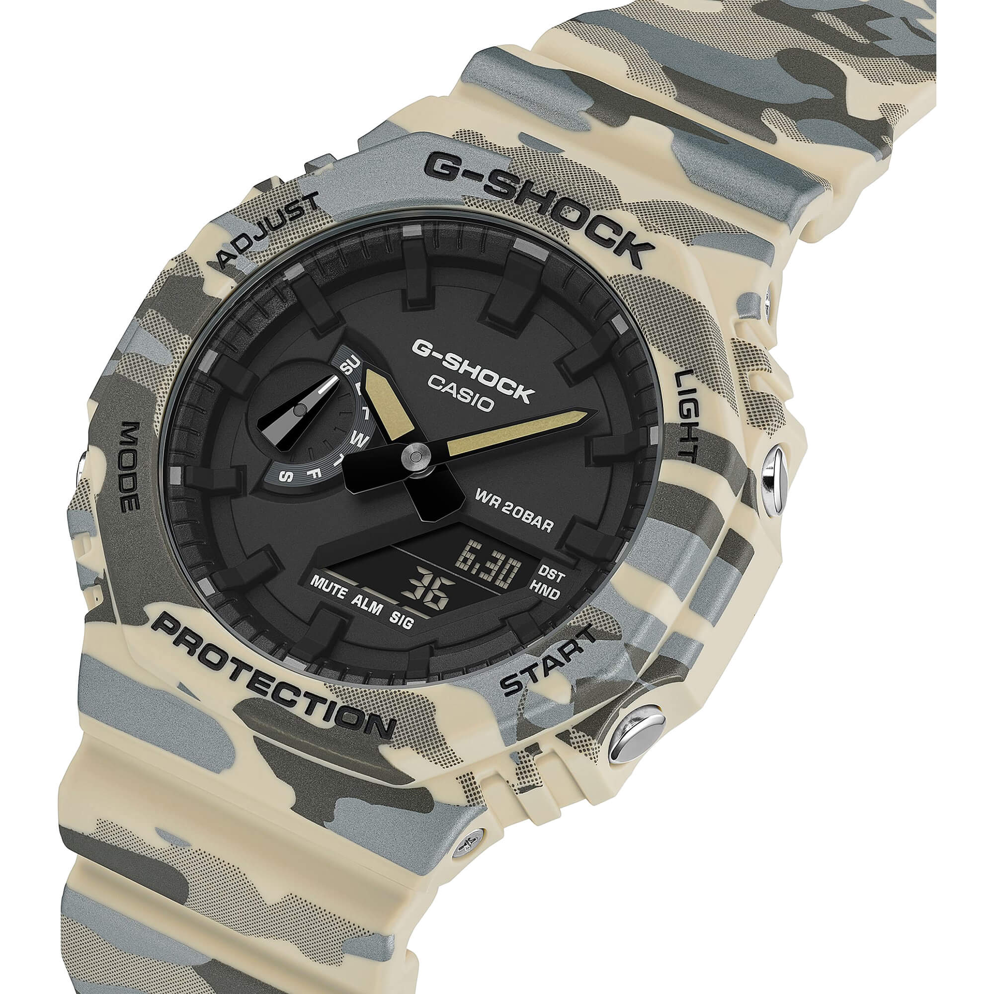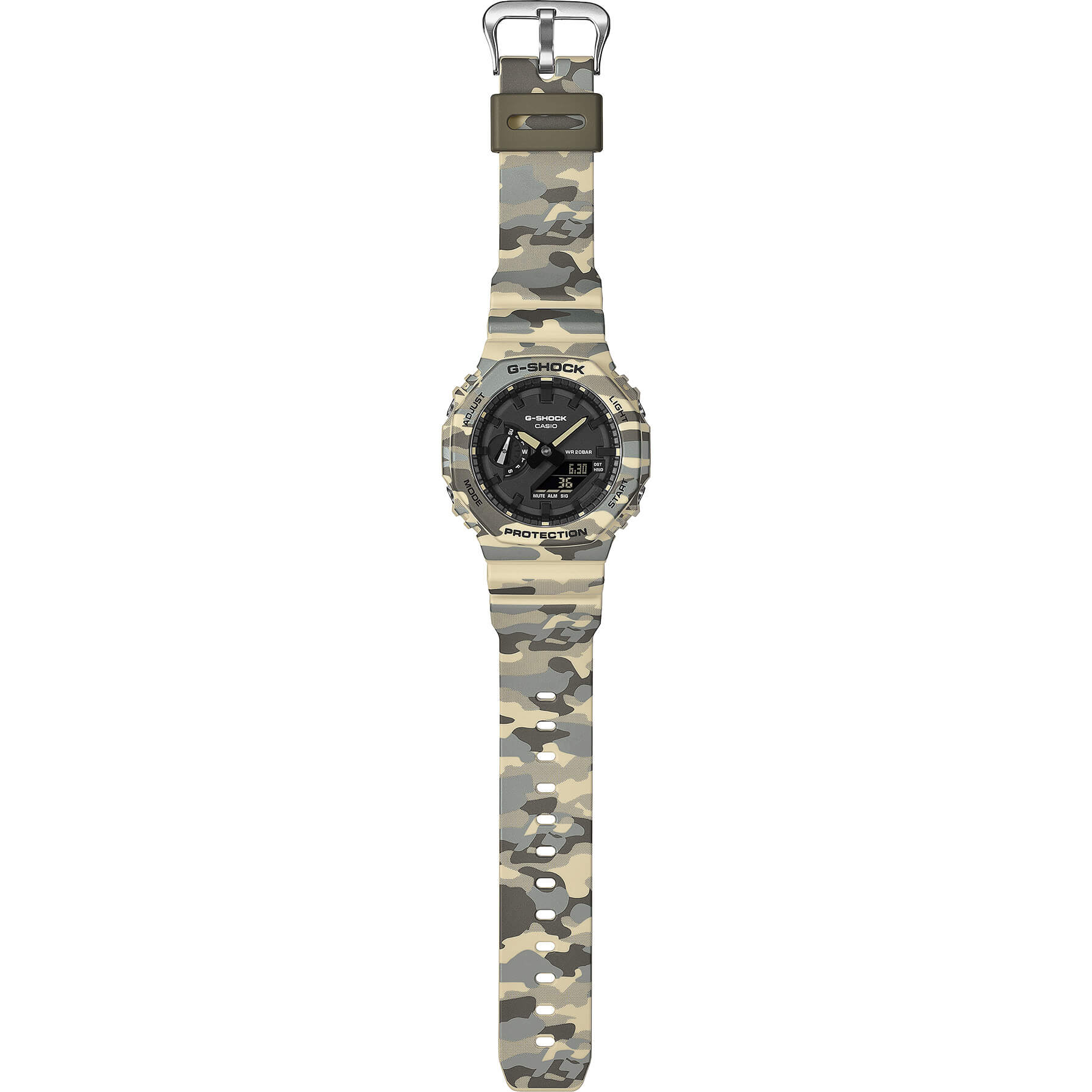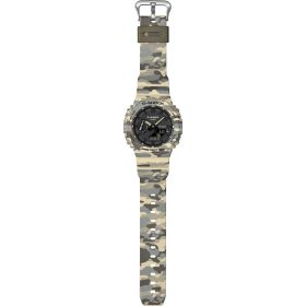 Sportlich, markant und im angesagten Camouflage-Look: Die beliebte GA-2100 setzt mit ihrem außergewöhnlichen G-SHOCK Muster ein echtes Statement am Handgelenk. Das Design greift das ikonische G-Symbol der Marke auf und integriert es dezent in ein dynamisches Tarnmuster – ein selbstbewusster und unverwechselbarer Look. Ein edler Metallic-Druck verleiht dem klassischen Camouflage-Design zusätzliche Tiefe und sorgt für eine moderne, raffinierte Optik. In angesagten Farbvarianten, die perfekt zu Gorpcore und urbaner Outdoor-Mode passen, verbindet die Uhr markantes Design mit der robusten Funktionalität, für die G-SHOCK bekannt ist. Lünette und Armband bestehen aus biobasiertem Resin, einem nachhaltigen Material auf Basis von Mais. Dieses Polymer wird aus erneuerbaren organischen Ressourcen hergestellt und trägt dazu bei, die Umweltbelastung zu reduzieren und eine zukunftsfähigere Kreislaufwirtschaft zu fördern.Produktspezifikationen