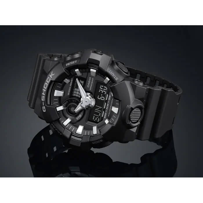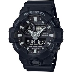 Die beliebte GA-700 Serie kommt im coolen analog-digitalen Design. Charakteristisch sind ihr großes Gehäuse, das strahlende Zifferblatt mit den dynamischen Indizes für einen 3D-Look sowie ihr absolut tougher Style. Die Fronttaste auf der 6-Uhr-Position aktiviert den Super Illuminator. Die GA-700 kombiniert auffälliges Design mit neuesten Funktionen für alle Streetstyle-Fans.Produktspezifikationen