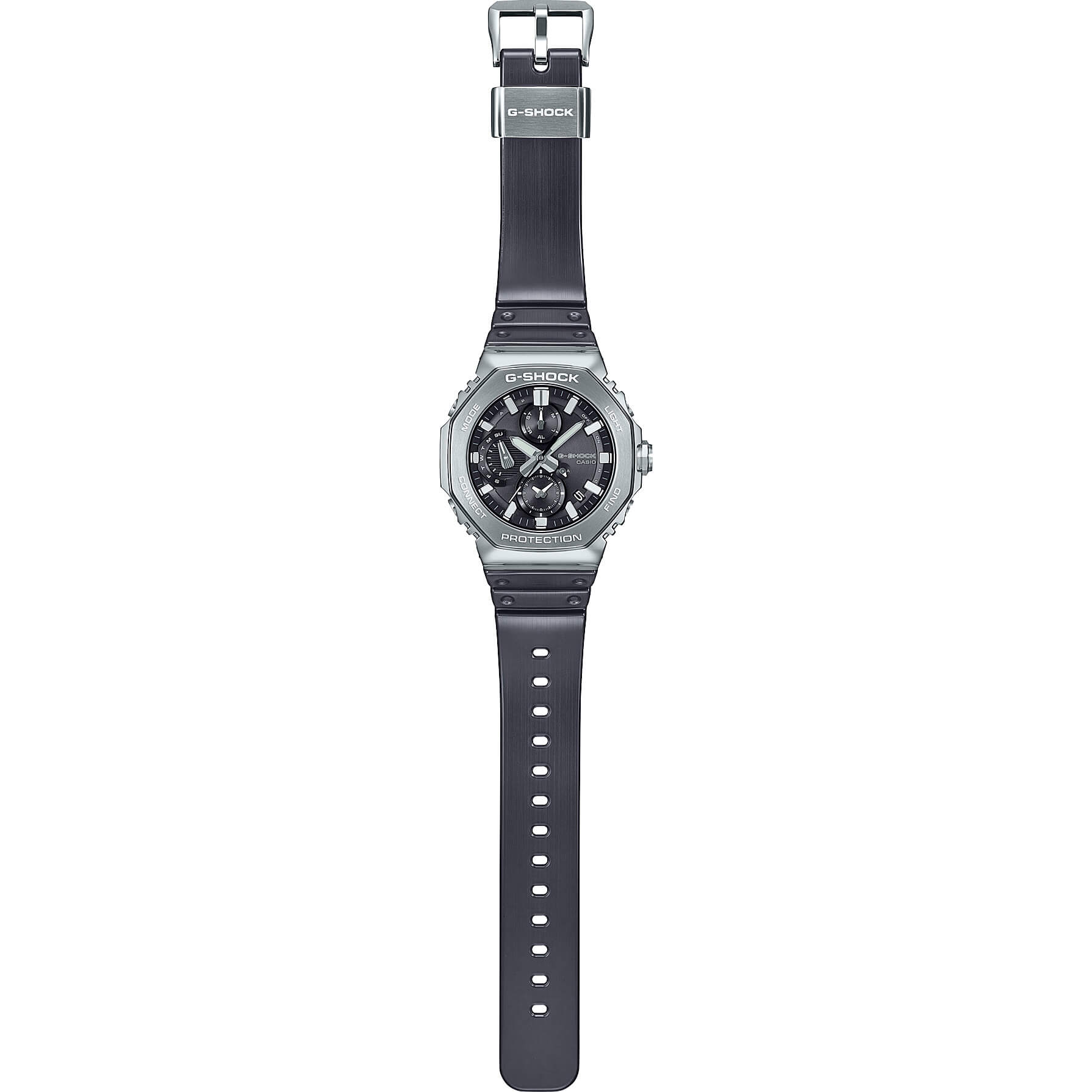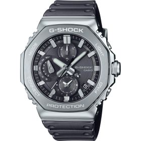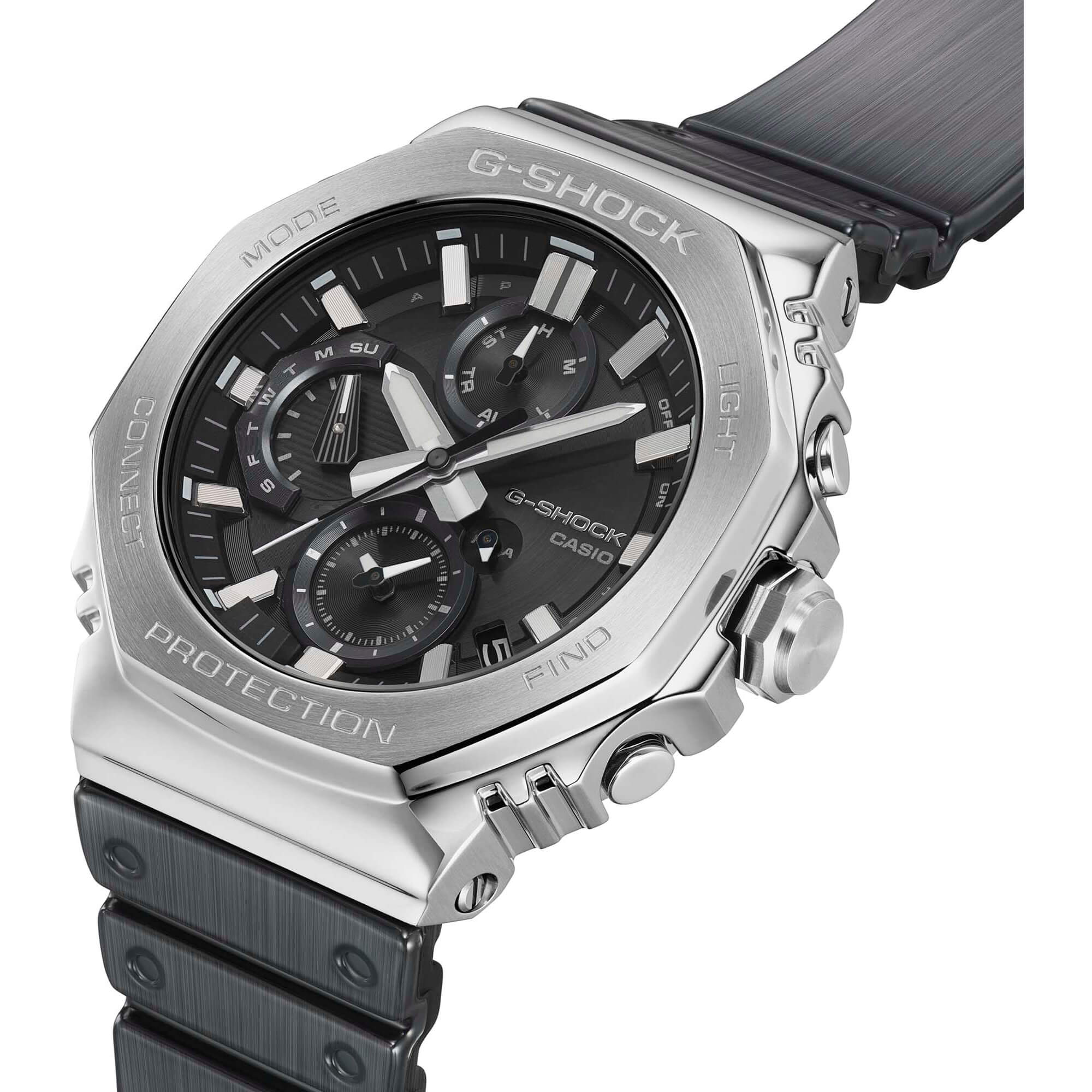 Der elegante Glanz der GMC-B2100Y, eines Vollmetall-Chronographen im 2100er-Stil, setzt das Erbe der allerersten G-SHOCK fort. Die achteckige Lünette orientiert sich an der ursprünglichen DW-5000C von 1983, wird nun jedoch aus Edelstahl gefertigt. Zwischen Gehäuse und Lünette sorgen feine Pufferelemente aus Kunstharz für eine stoßfeste Konstruktion. Die Edelstahllünette selbst ist dreidimensional geformt und durch einen aufwändigen Schmiede-, Schneid- und Polierprozess bearbeitet, wobei die Oberseite ein Hairline-Finish und die abgeschrägten Kanten eine Spiegelpolitur erhalten – ein harmonisches Zusammenspiel aus Robustheit und Ästhetik. Die Indexe und eingelassenen Zifferblattringe sind mit einer präzisen Aufdampflackierung versehen und zeigen durch filigrane Abformung und exakte Verarbeitung raffiniert ausgearbeitete Details. Das Band aus weichem, komfortablem Silikon ist an der Oberseite mit einer Urethanfolie geschützt, um Abrieb zu minimieren, während die Unterseite mit einem transparenten Gunmetal-Finish veredelt ist. Die fein strukturierte Oberfläche ergänzt das glänzende Vollmetallgehäuse perfekt. Dank hochdichter Montage bleibt das Analog-Digital-Kombinationsmodul schlank, ohne auf die erweiterten Funktionen zu verzichten, und sorgt so für hohen Tragekomfort. Über Bluetooth® lässt sich die Uhr mit dem Smartphone verbinden, sodass die präzise Zeit stets synchronisiert wird. Mit Tough Solar, hellem LED-Licht und zahlreichen praktischen Funktionen vereint die GMC-B2100Y Stil, Komfort und technische Raffinesse in einem kompakten, leistungsstarken Zeitmesser.Produktspezifikationen