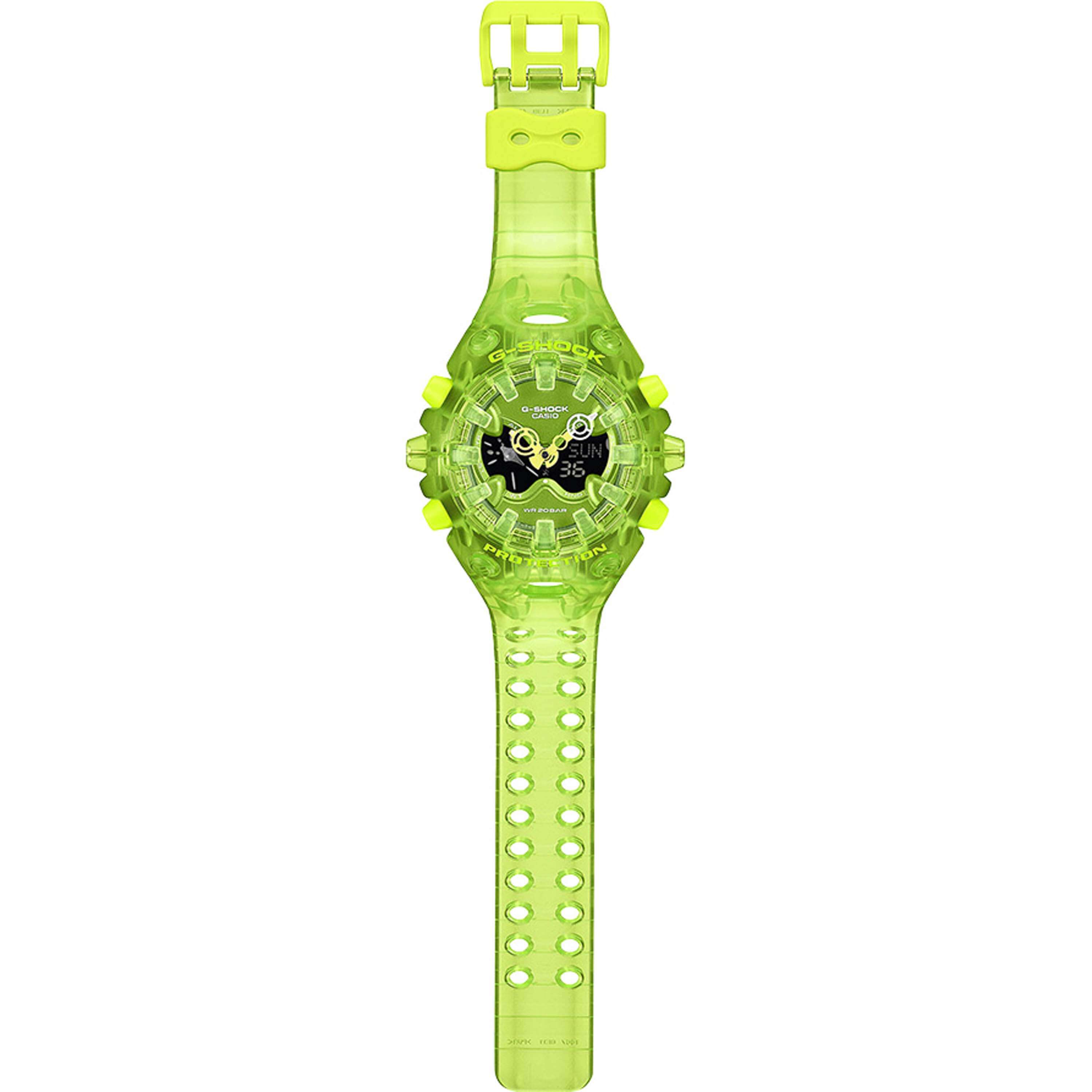 Das zentrale Gehäuse, das das Modul schützt, wird von einem äußeren Gehäuse mit integrierter Lünette und einer Bandkonstruktion abgedeckt. Dabei überlappen große Dimensionsindizes das Glas und fungieren als Stoßdämpfer. Dieses einzigartig leistungsstarke Design sorgt für einen völlig neuen Look, während die charakteristische Stoßfestigkeit von G-SHOCK erhalten bleibt.
