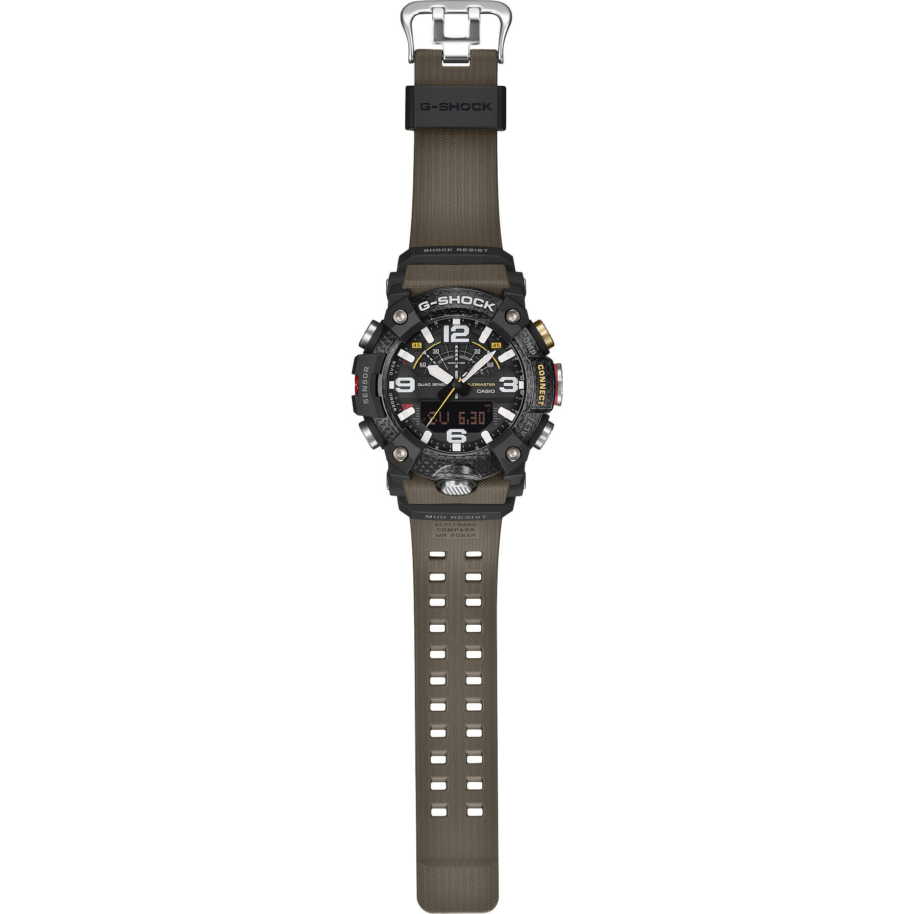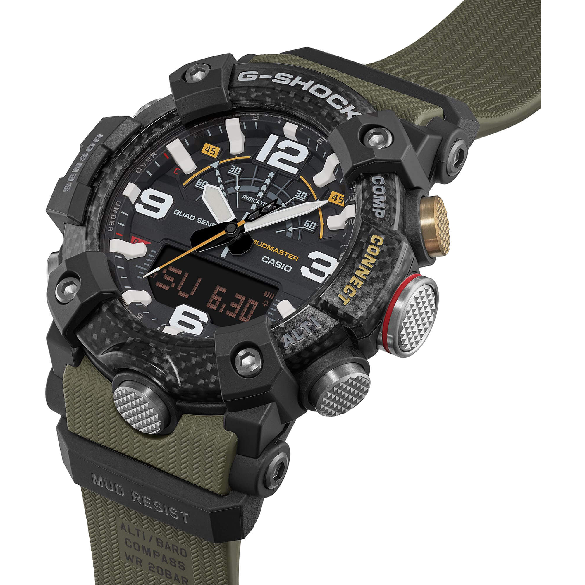 Für furchtlose Abenteurer und Naturliebhaber entwickelt: die MUDMASTER aus der G-SHOCK Master of G-Kollektion überzeugt mit einer Lünette und einem Gehäuse aus strapazierfähigem Carbon sowie ausgewählten umweltfreundlicheren Materialien. Die Modelle dieser Serie sind für Profis konzipiert, die unter extremsten Bedingungen arbeiten. Auch die MUDMASTER ist darauf ausgelegt, selbst härteste Einsätze an Land zu meistern – geschätzt von Rangern und Rettungskräften weltweit. Das hochresistente Carbongehäuse der GG-B100 bietet außergewöhnliche Stoßfestigkeit und Formstabilität sowie hohe Luftdichtheit. Ein spezieller Schlammfilter, eine Edelstahlrückseite und eine glasfaserverstärkte Kunstharzabdeckung schützen zuverlässig vor Staub und Schmutz. Die mehrschichtige Lünette mit Kohlefasereinsätzen unterstreicht den funktionalen, kraftvollen Charakter. Gehäuse- und Bandkomponenten aus biobasiertem Resin tragen zudem zu einem verantwortungsvolleren Materialeinsatz bei. Ausgestattet mit digitalem Kompass, Höhenmesser/Barometer, Thermometer und Schrittzähler unterstützt Sie dieser Zeitmesser bei jeder Herausforderung. Über die G-SHOCK App synchronisieren Sie die Zeit mühelos und nutzen praktische Funktionen wie das Mission Log, das Höhen- und Routendaten automatisch speichert. Auf diese Uhr können Sie sich verlassen – wenn es darum geht, schnell zu entscheiden und entschlossen zu handeln.Produktspezifikationen