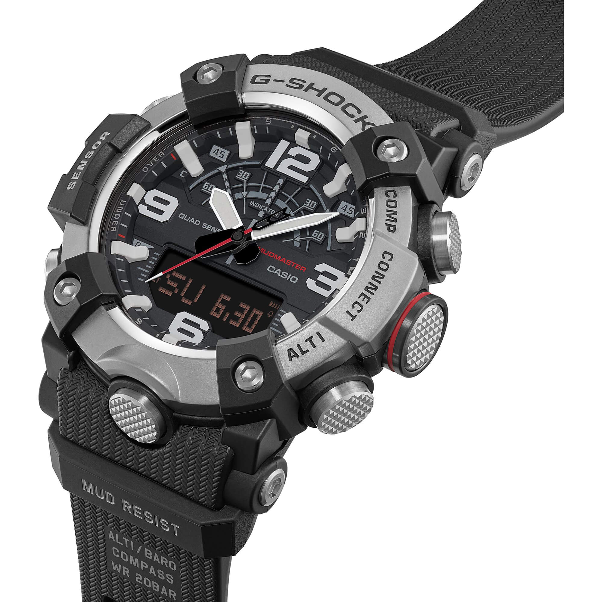 Die Master of G MUDMASTER ist eine besonders robuste und widerstandsfähige Uhr – entwickelt für Abenteurer, die sich auch unter extremen Bedingungen auf ihre Ausrüstung verlassen müssen. Mit ihrer stabilen, langlebigen Metalllünette steht sie für kompromisslose Belastbarkeit. Die Modelle der G-SHOCK Master of G-Reihe wurden speziell für Profis konzipiert, die unter härtesten Bedingungen arbeiten. Die MUDMASTER geht dabei noch einen Schritt weiter und meistert selbst anspruchsvollste Einsätze an Land – geschätzt von Rangern und Rettungskräften weltweit. Die GG-B100XM-1ADR verfügt über eine silberfarbene Edelstahl-Lünette mit geschliffener, kratzfester Oberfläche, die zuverlässig vor Staub und Schmutz schützt und dank matter Struktur Lichtreflexionen reduziert. Das Carbongehäuse der GG-B100 sorgt für hohe Stoßfestigkeit und Formstabilität sowie ausgezeichnete Luftdichtheit. Ein integrierter Schlammfilter, eine Edelstahlrückseite und eine glasfaserverstärkte Kunstharzabdeckung erhöhen die Widerstandsfähigkeit zusätzlich. Gehäuse- und Bandkomponenten aus biobasiertem Resin tragen zu einem verantwortungsvolleren Materialeinsatz bei. Mit digitalem Kompass, Höhenmesser/Barometer, Thermometer und Schrittzähler behalten Sie stets die Kontrolle. Über die G-SHOCK App synchronisieren Sie die Zeit bequem und nutzen Funktionen wie das Mission Log zur automatischen Aufzeichnung von Höhen- und Routendaten. Auf diesen Zeitmesser können Sie sich verlassen – wenn schnelle Entscheidungen und entschlossenes Handeln gefragt sind.Produktspezifikationen