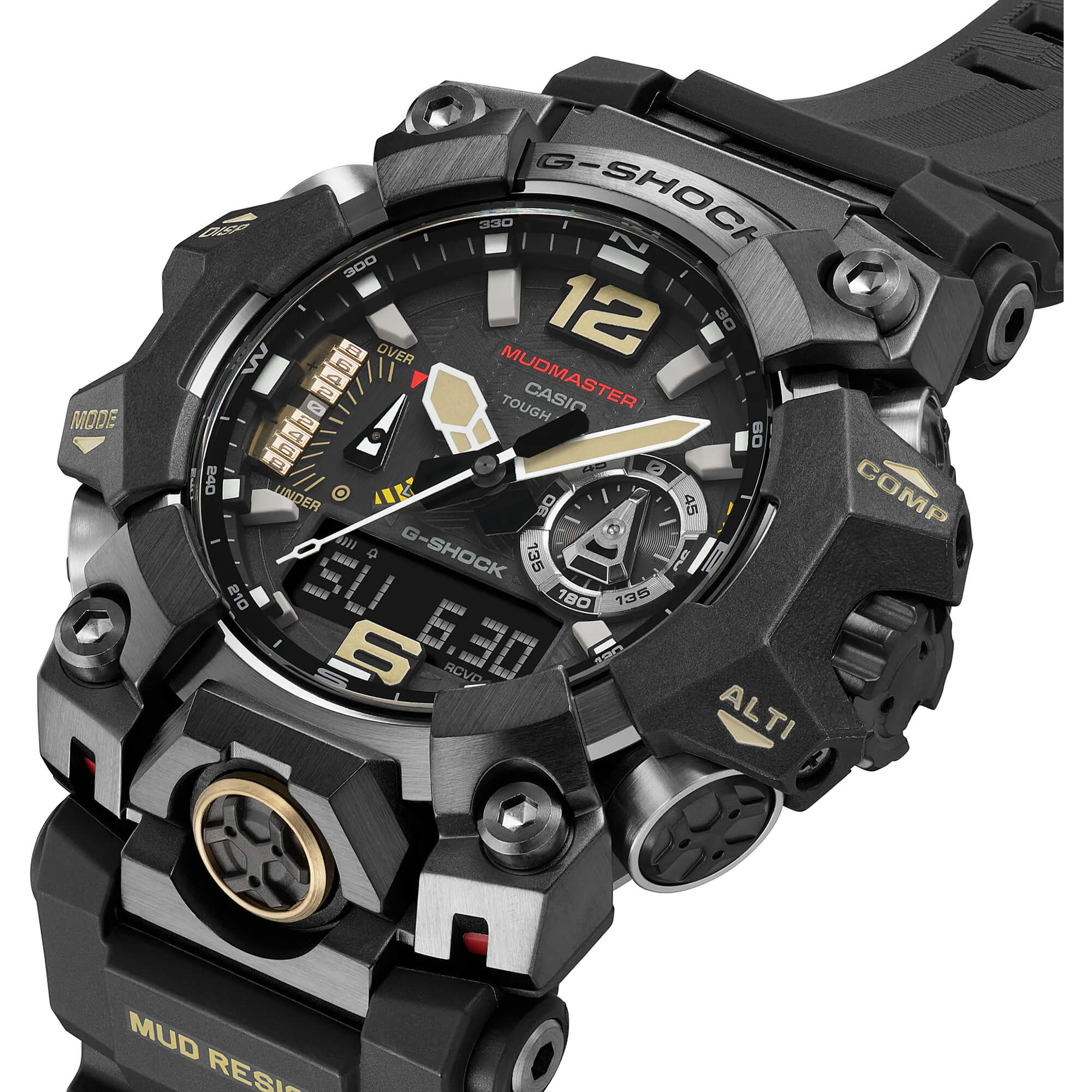Tauchen Sie ein in aufregende Abenteuer mit dem robusten Flaggschiff-Zeitmesser, dem Master of G Mudmaster. Diese Analog-Digital-Kombiuhr bietet nicht nur einen außergewöhnlichen Tragekomfort, sondern auch überragende Langlebigkeit dank ihrer widerstandsfähigen Metallkomponenten-Schutzkonstruktion. Die Uhren der G-SHOCK "Master of G"-Serie sind speziell für Profis in den härtesten Arbeitsumgebungen entwickelt und verfügen über noch widerstandsfähigere Features. Die MUDMASTER geht sogar noch einen Schritt weiter, da sie selbst den rauesten Bedingungen an Land standhält. Daher wird sie von Rangern und Rettungskräften, die in extremen Umgebungen arbeiten, geschätzt und vertraut. Die GWG-B1000 überzeugt nicht nur durch ihre handliche Größe, sondern auch durch ihr Gehäuse aus Metall, das durch hochpräzise Schmiedetechniken gefertigt wurde. Das kohlenstofffaserverstärkte Kunstharzgehäuse bietet herausragende Festigkeit und Haltbarkeit. Diese funkgesteuerte und solarbetriebene Uhr verfügt über einen Dreifachsensor, der Sie stets über Richtung, Höhe, Luftdruck und Temperatur informiert. Mit der Doppel-LED-Beleuchtung und dem Saphirglas behalten Sie die Zeit und andere Messwerte bei allen Bedingungen stets im Blick. Dank der Positionsanzeige auf der 3-Uhr-Position können Sie Ihre Richtung selbst bei widrigen Bedingungen wie Sandstürmen leicht ablesen, indem Sie einfach eine spezifische Position in der App eingeben. Mit dem Einsatz von Ökoharzen für das Gehäuse, verschiedene Lünettenkomponenten und das Band unterstreichen wir unser Engagement für die Umwelt in der MUDMASTER-Serie.Produktspezifikationen