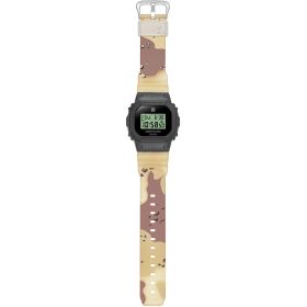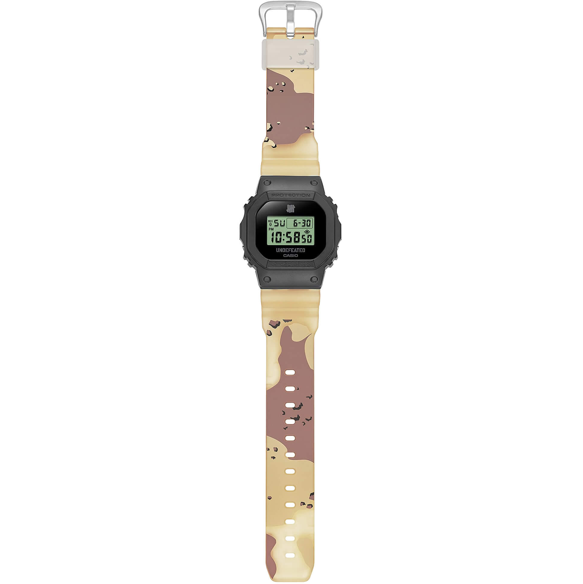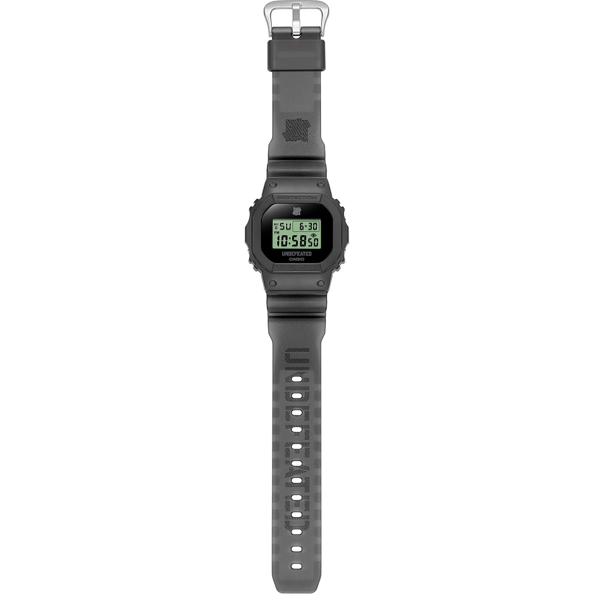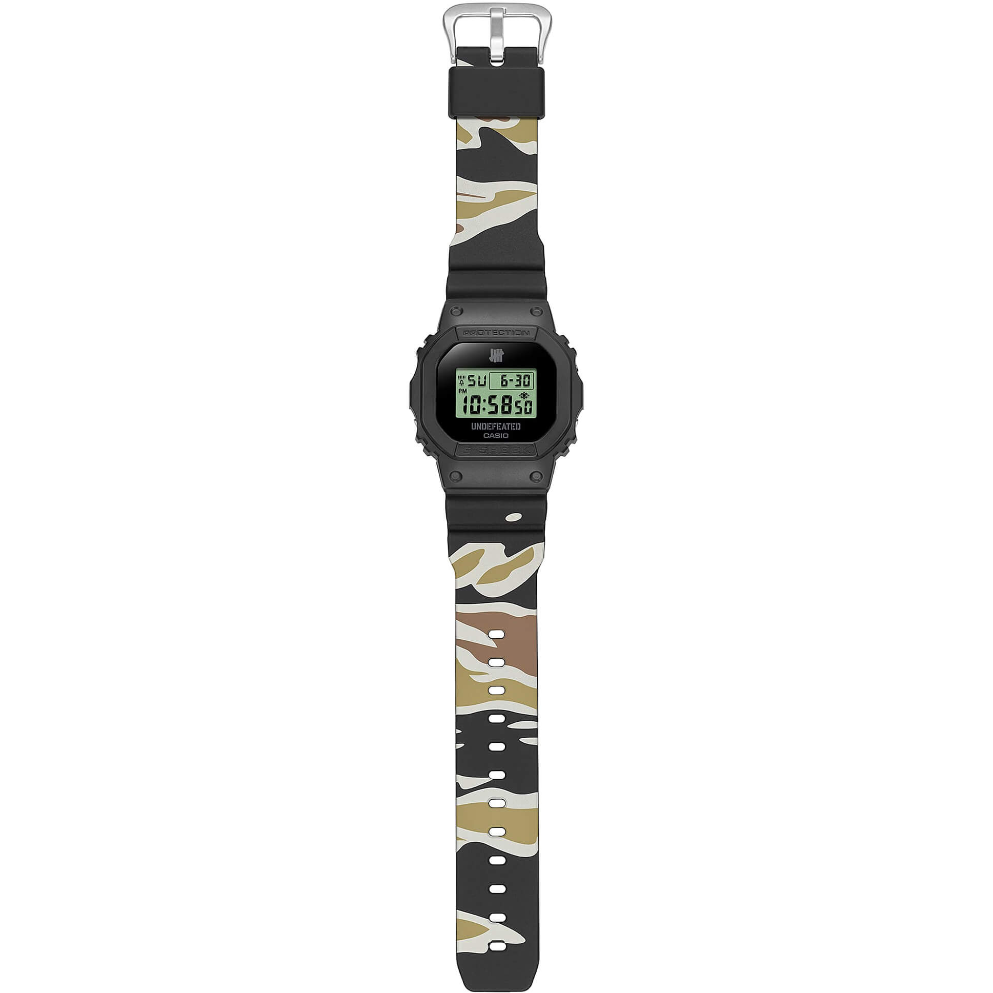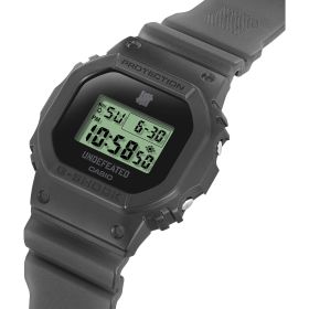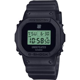 L.A.-Vibes am Handgelenk! G-SHOCK trifft auf die Streetwear-Legende UNDEFEATED – ein Statement für alle, die Urban Style leben. Die limitierte DWE-5600 kommt mit einem knallig grünen LCD-Display, eingebettet in ein halbtransparentes schwarzes Band. Das ikonische Five-Strikes-Logo ziert Display, Gehäuseboden und Band. Mit dabei: Zwei zusätzliche Wechselarmbänder im klassischen UNDEFEATED-Camo-Look – Tiger Camo (matt) und Storm Camo (halbtransparent). So kannst du deinen Style jederzeit anpassen. Verpackt im unverwechselbaren UNDEFEATED-Design ist diese Uhr mehr als nur ein Accessoire – sie ist ein Bekenntnis zur Street Culture.UNDEFEATED – seit 2002 Symbol für Sportstyle, Sneakerkultur und globale Streetwear-Einflüsse.