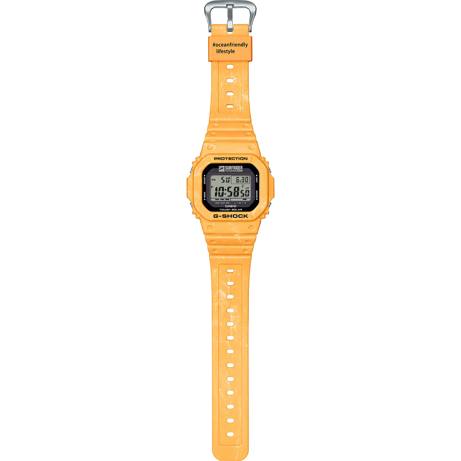 Im Einklang mit der Natur – in der Brandung beim ersten Licht des Tages. Diese besondere G-SHOCK entstand in Zusammenarbeit mit der Surfrider Foundation Japan und richtet sich an alle, die Surfen, Extremsport und den Schutz der Meere lieben. Die gemeinsame Vision: ein nachhaltiger Lebensstil und der Erhalt des maritimen Ökosystems. Das Design ist inspiriert von der beruhigenden Atmosphäre eines Strandes im goldenen Licht der Morgensonne. Warme Beige- und Gelbtöne spiegeln diesen besonderen Moment wider und machen jede Uhr zu einem Unikat – dank der speziellen Gussmischung gleicht kein Modell dem anderen. Gefertigt aus biobasiertem Resin und ausgestattet mit der umweltfreundlichen Tough Solar Technologie, vereint diese Uhr Funktionalität mit Umweltbewusstsein. Das Logo der Surfrider Foundation Japan ist auf dem Zifferblatt und dem Gehäuseboden zu sehen, während die Bandschlaufe mit dem Hashtag #oceanfriendlylifestyle bedruckt ist – ein Statement für einen bewussteren Umgang mit der Natur. Die Surfrider Foundation wurde 1984 in Kalifornien von Surfern ins Leben gerufen, die sich für sauberes Wasser und den Schutz der Meeresumwelt einsetzen. Heute ist sie in über 10 Ländern aktiv. Die japanische Sektion besteht seit 1993 und engagiert sich als eingetragener Verein seit 2011 für den Erhalt der Küstenregionen. Hinweis: Aufgrund der individuellen Farbverläufe und Materialeigenschaften kann jede Uhr in Optik und Textur leicht variieren.Produktspezifikationen