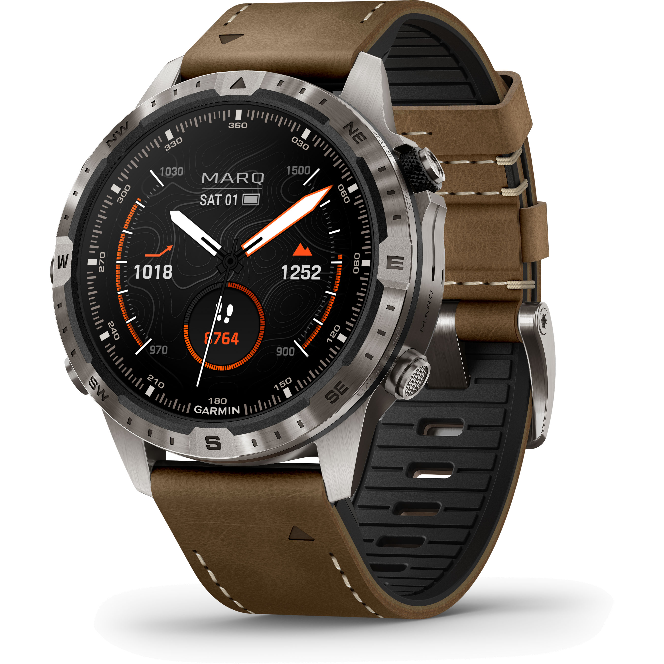 Entdecken Sie neue Abenteuer: Gemacht für extreme Bedingungen, um Sie höher und weiter zu bringen und immer wieder neues Terrain zu erkunden - das ist die MARQ Adventurer. Dank Titanium Grade 5 Gehäuse und Lünette mit gravierten Kompassmarkierungen ist sie widerstandsfähig wie nie. Das neue AMOLED Touchdisplay liefert in jeder Situation kontrastreiche, brilliante Darstellungen und der Akku läuft bis zu 16 Tage im Smartwatch- und bis zu 42 Stunden im GPS-Modus. Orienteiren Sie sich mit vorinstallierten Topoactive Karten und verfehlen Sie keine Abzweigung dank Nextfork. Verfolgen Sie Ihre Höhenprofile in Echtzeit und behalten Sie beim Aufstieg in Alpine Regionen Ihre Blutsauerstoffsättigung immer im Blick. Eingebaute ABC-Navigationssensoren halten Sie überall auf Kurs. Die MARQ 2 Adventurer ist für echte Pioniere, die vom Umbekannten magisch angezogen werden.Produktspezifikationen