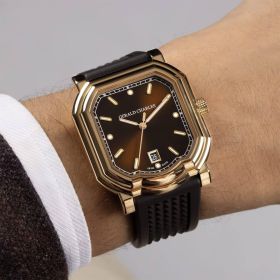 Gerald Charles präsentiert den Maestro 2.0 Ultra-Thin in einer ansprechenden Kombination von Schokoladenbraun und Roségold. Das schokoladenbraune Sonnenschliff-Zifferblatt der Uhr harmoniert perfekt mit dem vulkanisierten Kautschukarmband, das auf der Oberseite das Clous de Paris-Motiv und auf der anderen Seite das GC-Logo als Tapisserie trägt. Diese Elemente setzen einen stilvollen Kontrast zum 18K Roségold 4N des Maestro-Gehäuses sowie zur polierten Dornschließe mit gebürsteter Applikationsplatte und eingraviertem GC-Logo. Der Sonnenschliff erzeugt ein faszinierendes Spiel aus Lichtreflexen, bei dem unterschiedliche Farbschichten je nach Lichteinfall warm oder kühl wirken.Produktspezifikationen