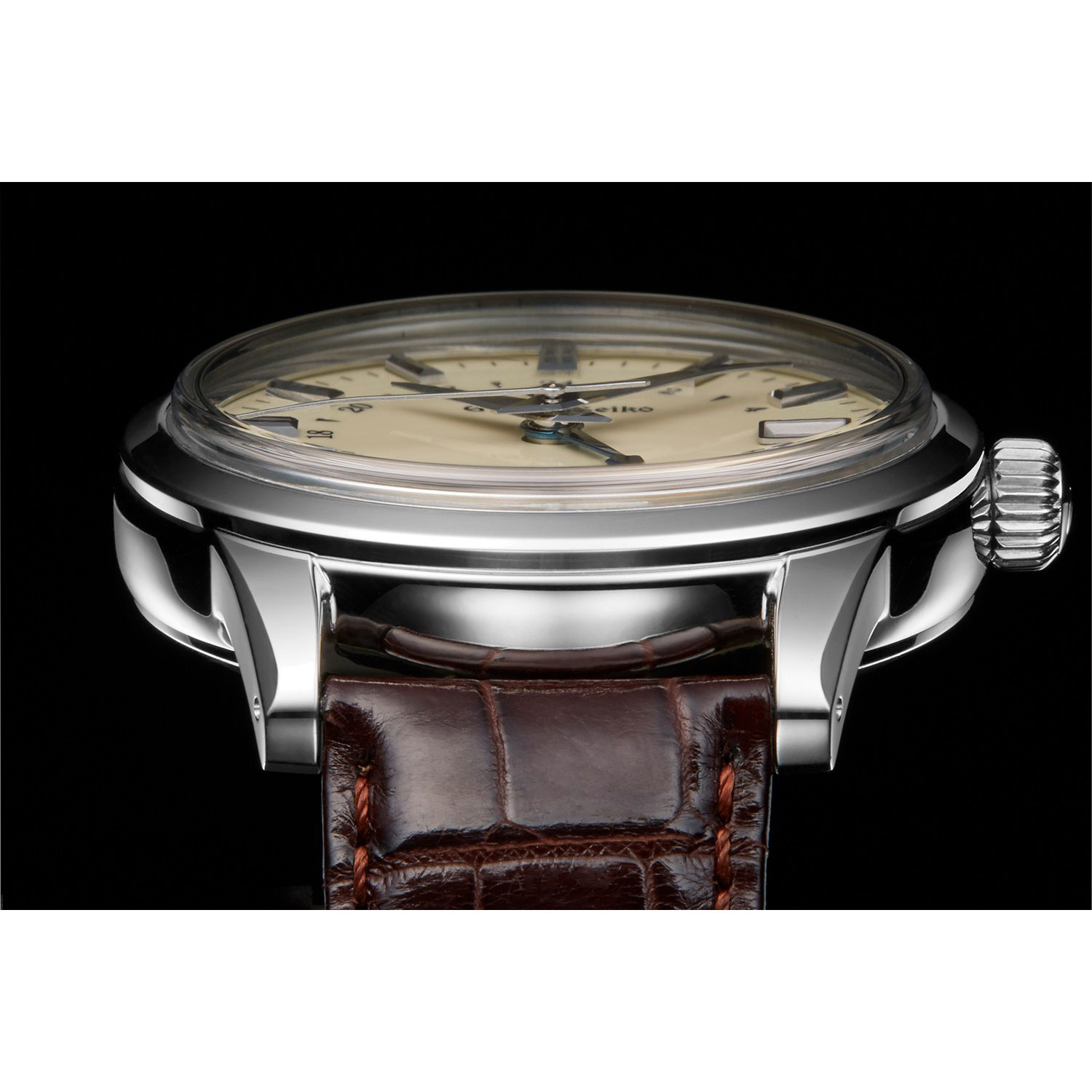 Die klassische Uhr mit GMT Funktion - ausgestattet mit dem weiterentwickelten Uhrwerk 9S66 - vereinigt einen Stil, der Uhrenliebhaber bereits lange Zeit bezaubert. Die Uhr hat eine Gangreserve von bis zu 3 Tagen und vereinigt die neueste Spiralfedertechnologie mit einer durch MEMS-Technologie entwickelten Hemmung, um hohe Genauigkeit und Stabilität während des Tragens zu erreichen. Das Design verkörpert eine reine, klassische Eleganz mit einem bis über die Lünette gewölbten Saphirglas, Zaratsu polierten Bandanstößen, einem braunen Lederband und einem stahlblauen 24-Stunden-Zeiger, der das tief elfenbeinfarbige Zifferblatt komplementiert. Die Feinheit, Stärke und Schönheit des Uhrwerks können durch den durchsichtigen Gehäuseboden bewundert werden.