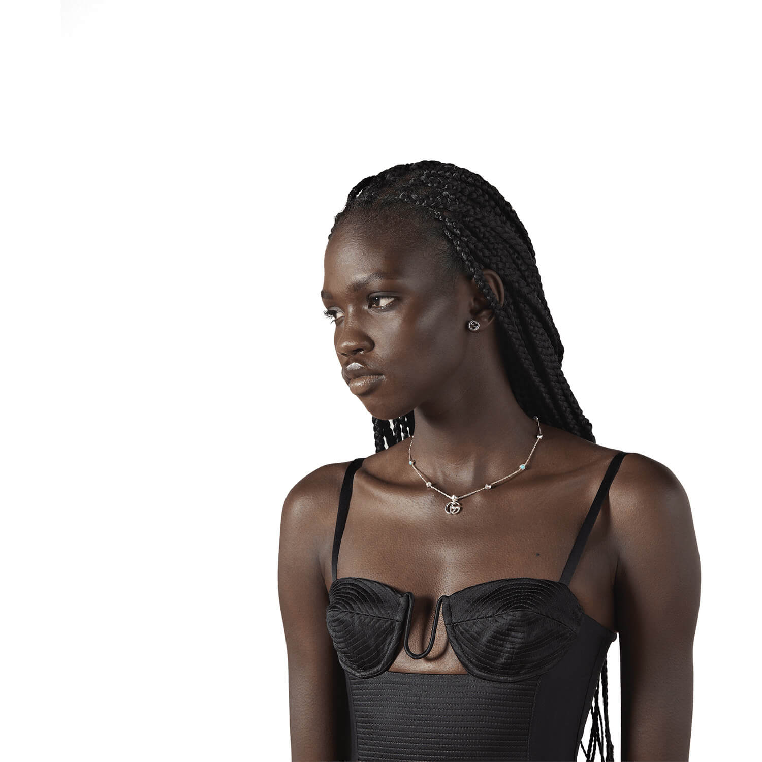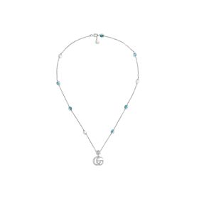 Das Doppel G – eine Wiedereinführung des unverwechselbaren Emblems aus dem Hause Gucci – hängt an einer Halskette aus Sterlingsilber 925 mit Steinen aus Perlmutt, türkisfarbenem Kunstharz und Topas.Produktspezifikationen