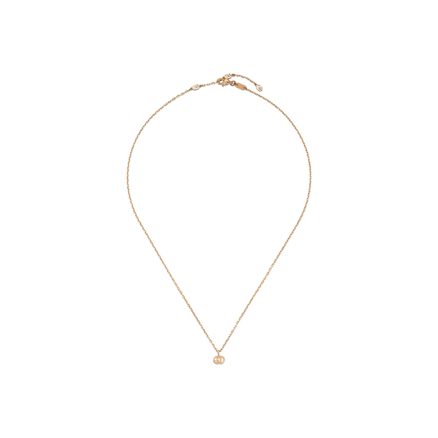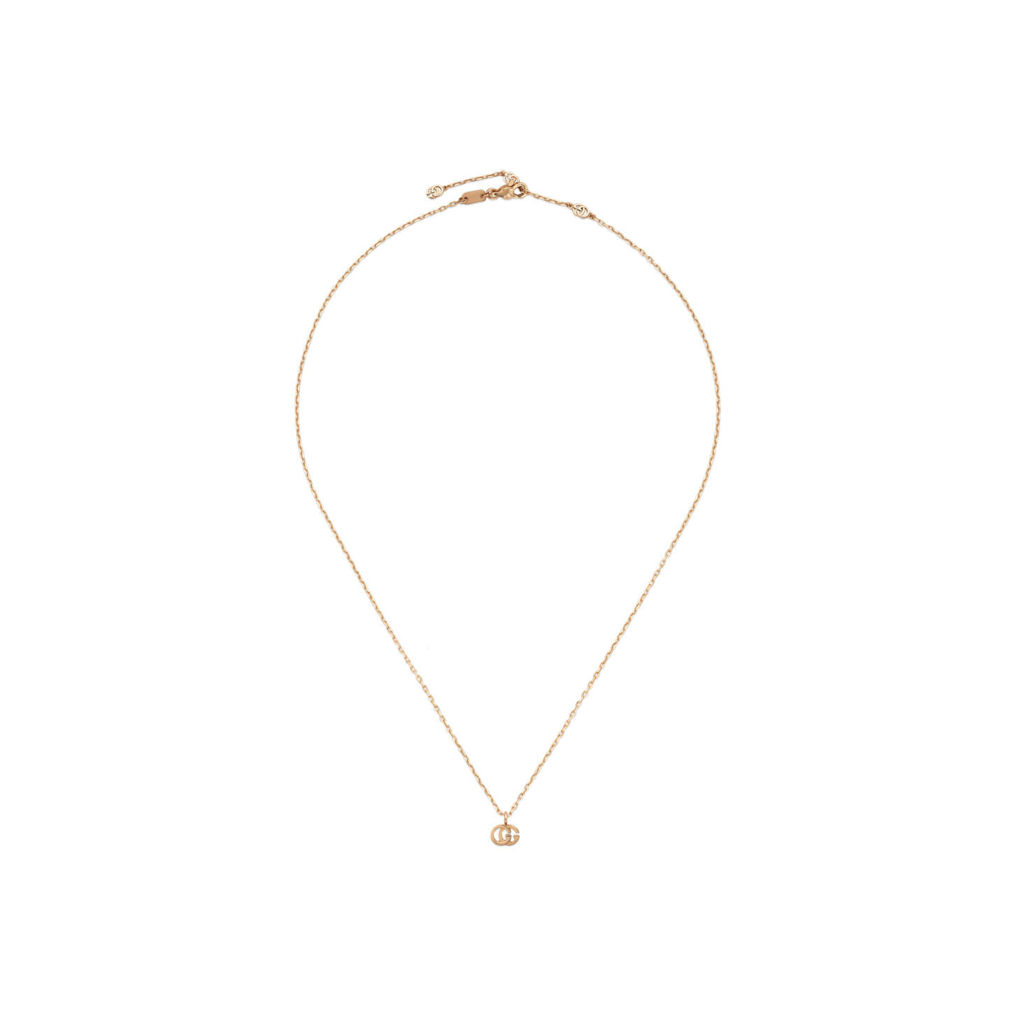 Die einzigartigen GG Running Kreationen aus der Gucci Love Parade Kollektion kehren in dieser Ausführung in zartem Roségold mit dem unverwechselbaren Doppel G zurück. Dieses Mal präsentiert sich das Motiv als zierlicher Anhänger an einer edlen Halskette aus 18-karätigem Gold.Produktspezifikationen