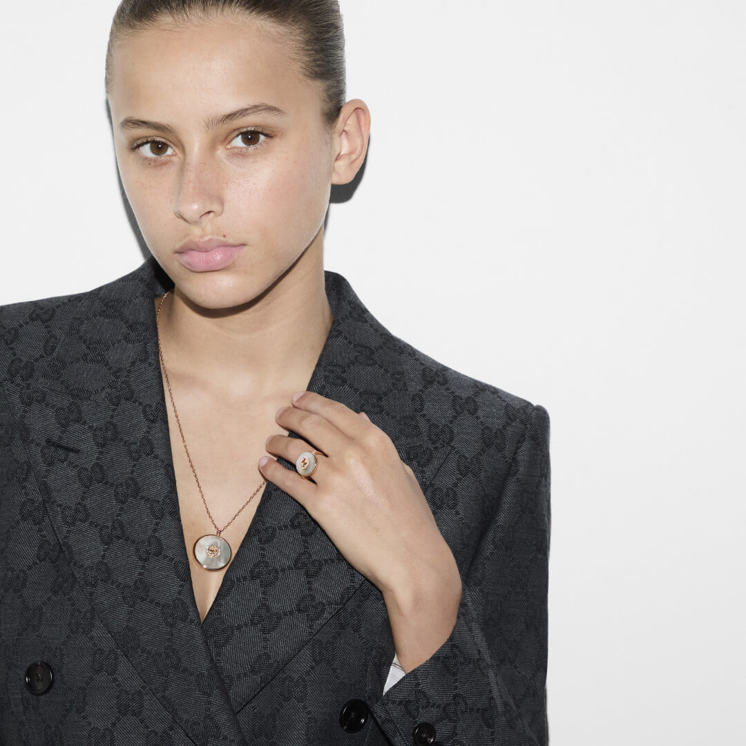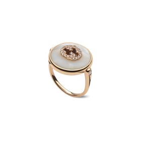 Für die Pre-Fall Kollektion 2024 präsentiert sich das GG Logo in raffinierten Neuinterpretationen. Ein Zusammenspiel von elegante Roségold, schimmerndem Perlmutt und einem Diamant-Pavé-Besatz kennzeichnet dieses Design. Dieser zarte Ring ist perfekt mit anderen Accessoires aus der gleichen Linie kombinierbar.Produktspezifikationen