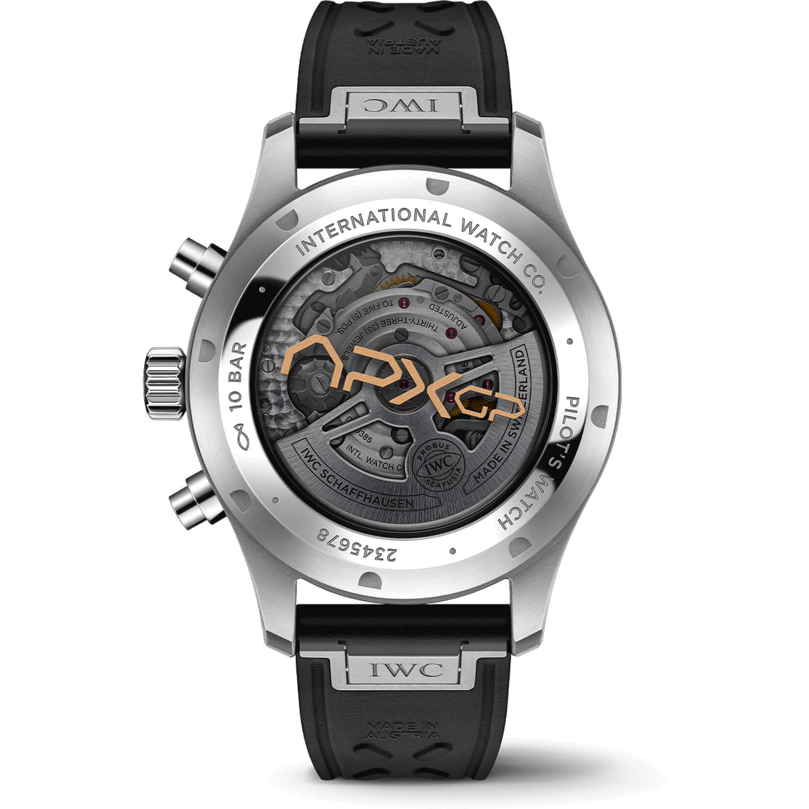 Pilot's Watch Chronograph APXGP – Rennsport trifft Haute Horlogerie. Diese besondere Edition der Pilot's Watch ist dem fiktiven „APXGP“-Rennteam aus dem Film F1® gewidmet und bringt den Adrenalinkick der Rennstrecke ans Handgelenk. Inspiriert vom Team-Farbschema vereint die Uhr kontraststarkes Schwarz mit leuchtendem Weiß und edlem Gold. Das 43 mm große Edelstahlgehäuse rahmt ein schwarzes Zifferblatt mit weißen Ziffern und goldfarbenen Minutenzählern. Vergoldete Zeiger, gefüllt mit weißer Super-LumiNova®, garantieren perfekte Ablesbarkeit bei Tag und Nacht. Auf der Rückseite ziert das „APXGP“-Logo in Gold das getönte Saphirglas, während eine Lasergravur auf dem strapazierfähigen Kautschukarmband eine weitere Hommage an das Filmteam setzt. Das integrierte EasX-CHANGE®-System ermöglicht einen schnellen Armbandwechsel – ganz ohne Werkzeug. Im Inneren arbeitet das IWC-Manufakturkaliber 69385: ein mechanisches Chronographenwerk mit Kolonnenrad, das Stoppzeiten bis zu 12 Stunden misst und eine Gangreserve von 46 Stunden bietet. Die intuitive Zifferblattarchitektur mit vertikaler Anzeige sorgt für maximale Übersichtlichkeit – ganz im Zeichen der Performance.Produktspezifikationen