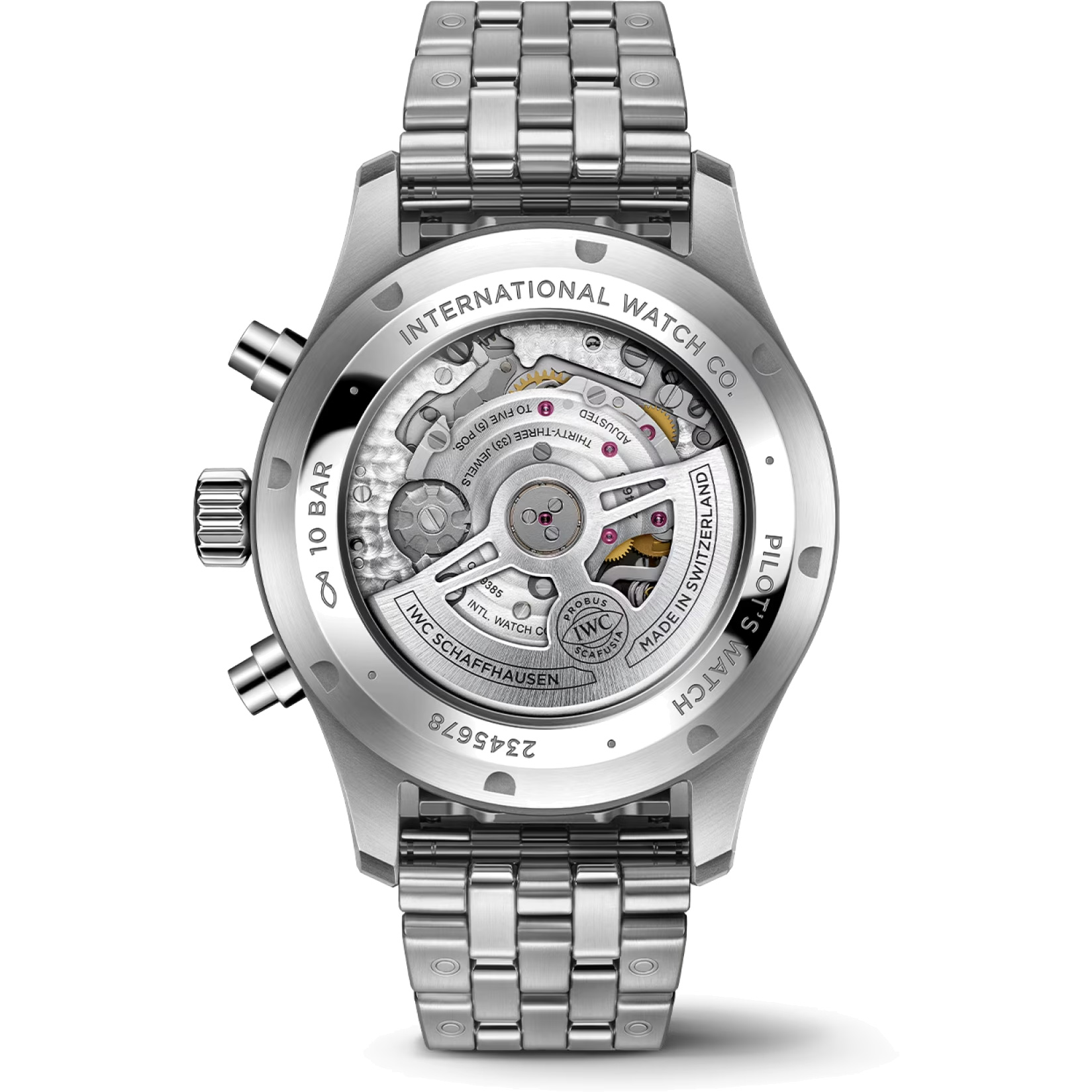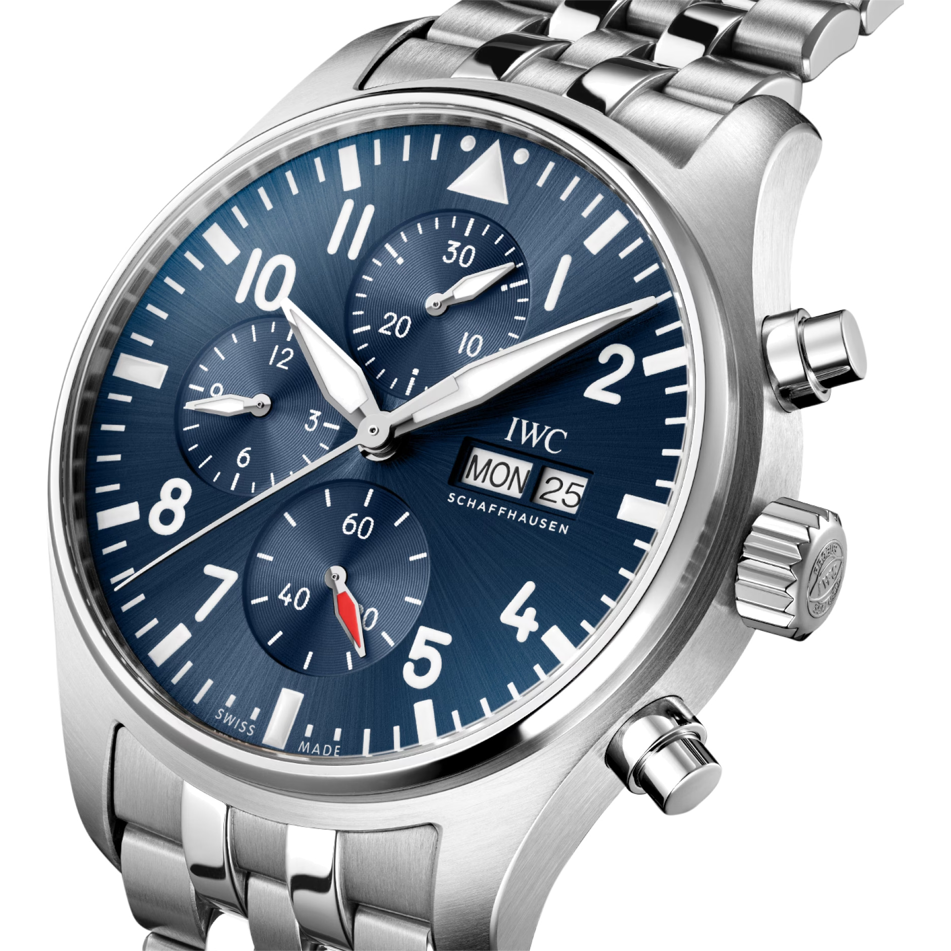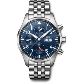 Der Pilot's Watch Chronograph ist der Inbegriff einer vielseitigen Sportuhr und ein ausgezeichneter Begleiter in allen Lebenslagen. Er verfügt über ein 43mm Gehäuse aus Edelstahl, ein blaues Zifferblatt sowie rhodinierte Zeiger. Das kontrastreiche Zifferblatt mit den grossen arabischen Zahlen und dem Markierungsdreieck bei 12 Uhr ist im Stil eines einfach ablesbaren Cockpit-Instruments gestaltet. Dank Leuchtelementen lässt sich die Zeit auch in der Nacht oder bei schwierigen Sichtverhältnissen auf einen Blick ablesen. Das IWC-Manufakturkaliber 69385, ein präzises und robustes Chronographenwerk in klassischer Kolonnenradbauweise, ermöglicht die Messung von Stopp- oder Additionszeiten bis zu 12 Stunden. Die gemessenen Stunden werden auf dem Zähler bei 9 Uhr und die Minuten bei 12 Uhr angezeigt, während sich die kleine Sekunde mit einem roten Zeiger bei 6 Uhr befindet. Das dekorierte Uhrwerk mit Automatikaufzug und einer Gangreserve von 46 Stunden ist durch den Saphirglasboden sichtbar.Produktspezifikationen