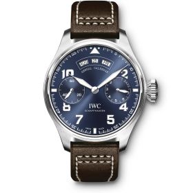 IWC Big Pilot's Watch Annual Calendar Edition "Le Petit Prince", 18 Karat Weißgoldgehäuse, braunes Kalbslederarmband von Santoni, blaues Zifferblatt mit Lumineszenz, Jahreskalender mit Anzeige von Monat, Datum und Wochentag, Automatischer Pellaton-AufzugProduktspezifikationen