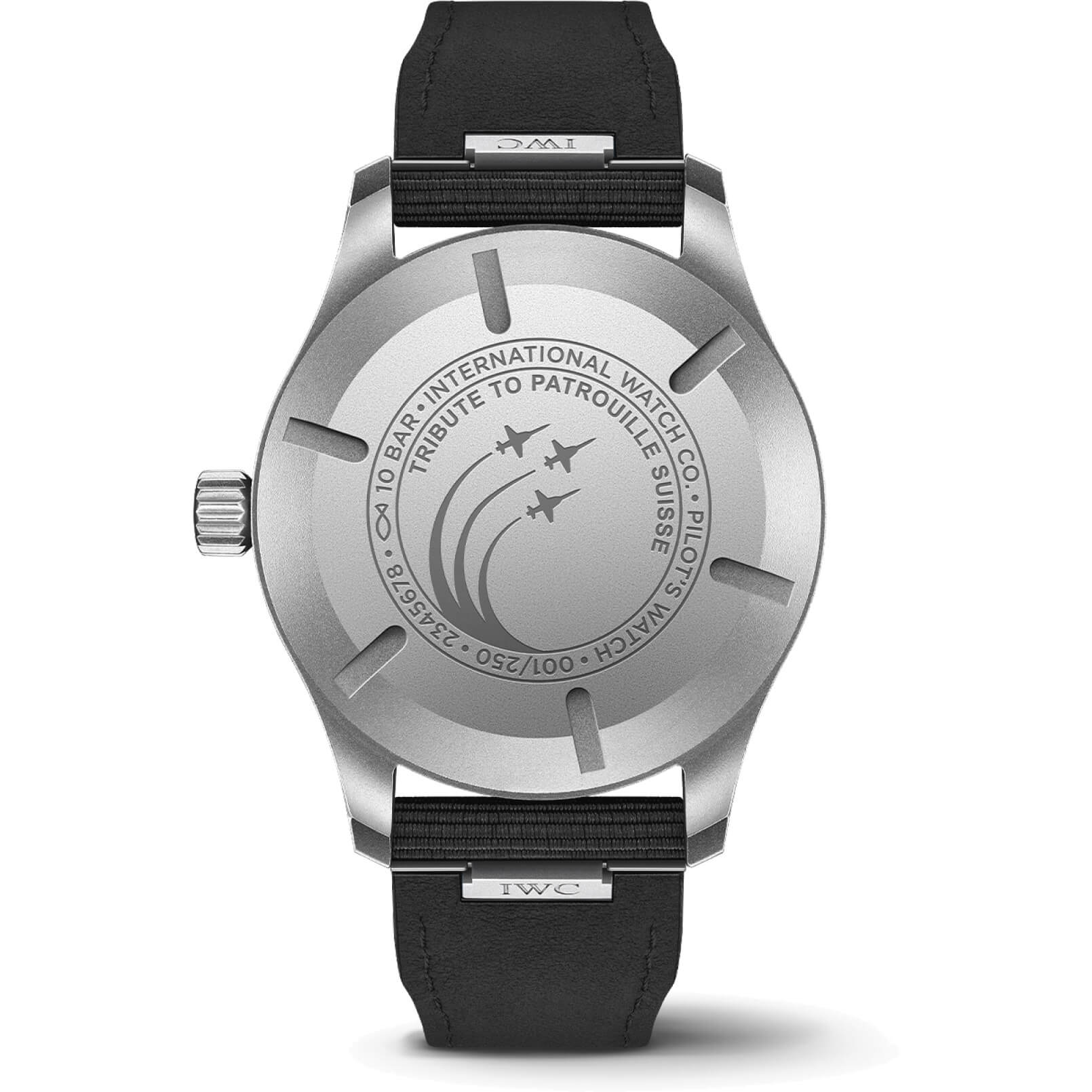 Mit der Pilot’s Watch Mark XX Patrouille Suisse ehrt IWC Schaffhausen die gleichnamige Kunstflugstaffel der Schweizer Luftwaffe. Seit ihrer Gründung im Jahr 1964 hat sich die Patrouille Suisse der Aufgabe verschrieben, die Leistungsfähigkeit, Präzision und Einsatzbereitschaft der Schweizer Luftwaffe sowohl im In- als auch im Ausland zu demonstrieren. Ihre markanten rot-weißen F-5 E Tiger Jets werden von Piloten des Berufsfliegerkorps gesteuert. Formationsflüge erfordern höchste Präzision und technische Perfektion – Eigenschaften, die auch in der Uhrmacherkunst unverzichtbar sind. Die auf 250 Exemplare limitierte Pilot’s Watch Mark XX Patrouille Suisse stellt bereits die fünfte Sonderedition dar, die IWC zu Ehren der Patrouille Suisse geschaffen hat, und gleichzeitig die erste mit einem Gehäuse aus Titan. Titan bietet das höchste Verhältnis von Festigkeit zu Dichte aller Metalle, ist äußerst robust und wiegt etwa ein Drittel weniger als Stahl. Das 40 Millimeter große Titangehäuse besitzt eine mattgraue, gestrahlte Oberfläche. Der ebenfalls aus Titan gefertigte Gehäuseboden ist mit einer besonderen Gravur versehen, die neben drei Flugzeugen im Formationsflug den Schriftzug „Tribute to Patrouille Suisse“ sowie die individuelle Limitierungsnummer zeigt. Das Titangehäuse wird von einem grauen Zifferblatt und schwarzen Zeigern mit Leuchtmasse ergänzt. Diese Sonderedition wird vom IWC-Manufakturkaliber 32111 angetrieben, einem präzisen Automatikwerk mit einer Gangreserve von 120 Stunden. Die Uhr ist mit einem schwarzen Textilarmband und einer Dornschließe aus Titan ausgestattet, wobei beide über das EasX-Change-System verfügen.Produktspezifikationen