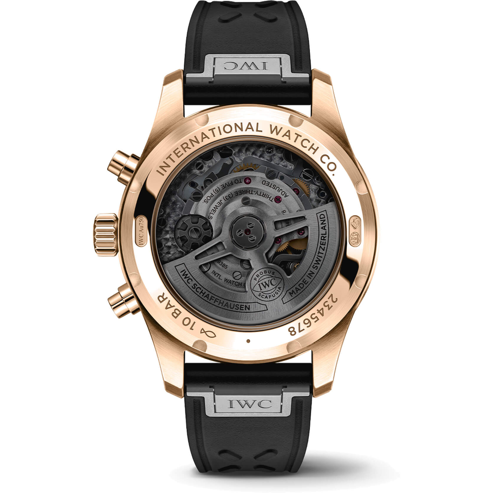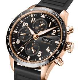 Der Pilot’s Watch Performance Chronograph 41 ist IWC Schaffhausens erster Performance-Chronograph im Edelmetallgehäuse. Aus 18 Karat Rotgold gefertigt, vereint er kraftvolle Funktion mit stilvoller Eleganz: Das tiefschwarze Zifferblatt mit feinem Lack-Finish trifft auf vergoldete Applikationen und Zeiger. Die handpolierten Indizes und das ikonische Dreieck bei 12 Uhr sind mit Super-LumiNova® gefüllt und sorgen für optimale Ablesbarkeit – auch bei Dunkelheit. Ein sportlich-technisches Highlight ist die schwarze Keramiklünette mit Tachymeterskala, mit der sich Durchschnittsgeschwindigkeiten präzise ermitteln lassen. Im Inneren arbeitet das IWC-Manufakturkaliber 69385 – ein robustes Chronographenwerk mit klassischer Kolonnenradkonstruktion, sichtbarer Mechanik und bis zu 12 Stunden Stoppfunktion. Ein schwarzes Kautschukarmband mit EasX-CHANGE® System rundet den markanten Auftritt dieser leistungsstarken Fliegeruhr ab.Produktspezifikationen