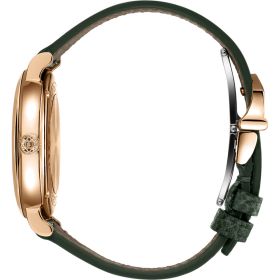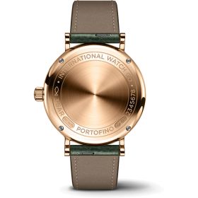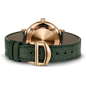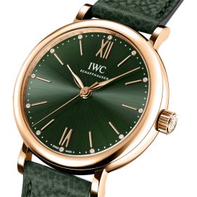 Mit ihrer schlichten Eleganz verkörpert die Portofino Automatic 34 die Essenz der IWC Portofino Linie. Mit ihrem ebenso raffinierten wie zurückhaltenden Design strahlt die Portofino eine bemerkenswerte Frische und Reinheit aus. Die Portofino Automatic 34 passt dank ihrer reduzierten Gehäusegrösse perfekt an schmale Handgelenke und bietet einen hervorragenden Tragekomfort. Sie knüpft zudem an die Anfänge der Linie in den 1980er Jahren an, als IWC eine Reihe von Portofino-Referenzen mit ähnlich kleinen Dimensionen herausbrachte. Diese Version ist mit einem Gehäuse aus Rotgold ausgestattet. Vergoldete Indizes, römische Ziffern bei 6 und 12 Uhr sowie schlanke Feuille-Zeiger bilden einen reizvollen Kontrast zum grünen Zifferblatt, auf dem zwölf strahlend weisse Diamanten die Stunden markieren. Die schlichte und elegante Damenuhr ist mit einem passenden grünen Kalbslederarmband mit Butterfly-Faltschliesse ausgestattet. Dank des integrierten Schnellwechselsystems kann das Armband im Handumdrehen gewechselt und die Uhr so an verschiedene Outfits oder Anlässe angepasst werden.Produktspezifikationen
