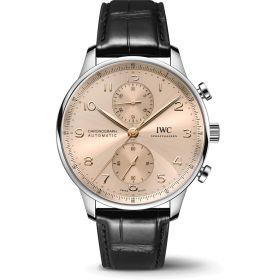 Diese Version der Portugieser Chronograph besticht durch ein frisches und modernes Design mit einem sparkling Beige Zifferblatt gleichfarbigen Hilfszifferblättern. Ikonisches Portugieser-Design, vereint mit einer praktischen und einfach zu bedienenden Chronographenfunktion: Dank der gelungenen Kombination aus Eleganz und Sportlichkeit ist die Portugieser Chronograph zu einer der grössten Ikonen von IWC Schaffhausen geworden. Diese Version ist eine frische und zeitgemässe Interpretation des etablierten Designs mit einem 41-Millimeter-Edelstahlgehäuse, einem sparkling Beige Ziffernblatt und gleichfarbigen Hilfszifferblättern, goldfarbenen arabischen Ziffern und Feuille-Zeigern. Diese elegante Sportuhr ist mit einem schwarzen Alligatorlederband mit Faltschließe ausgestattet, um einen perfekten Sitz am Handgelenk zu gewährleisten und hohen Tragekomfort zu bieten.Produktspezifikationen