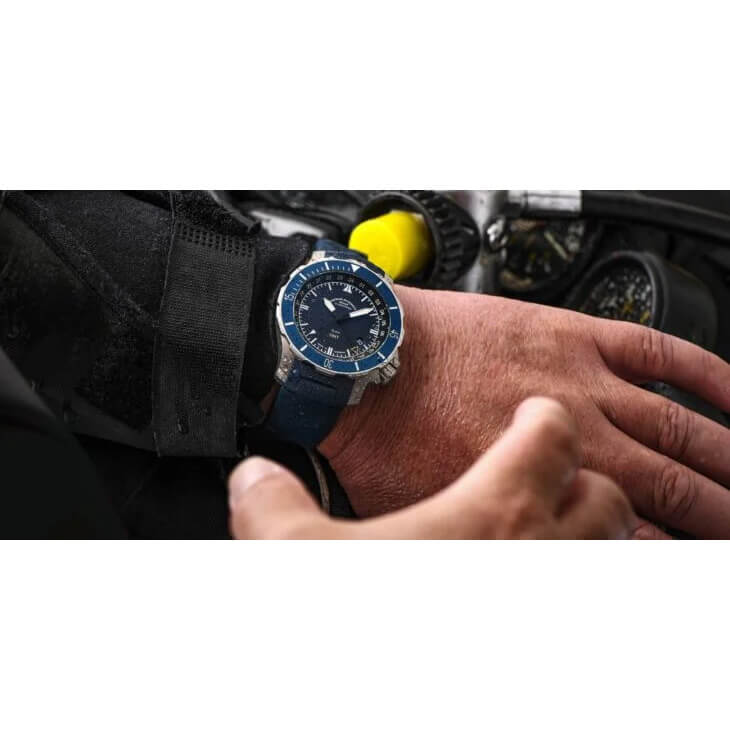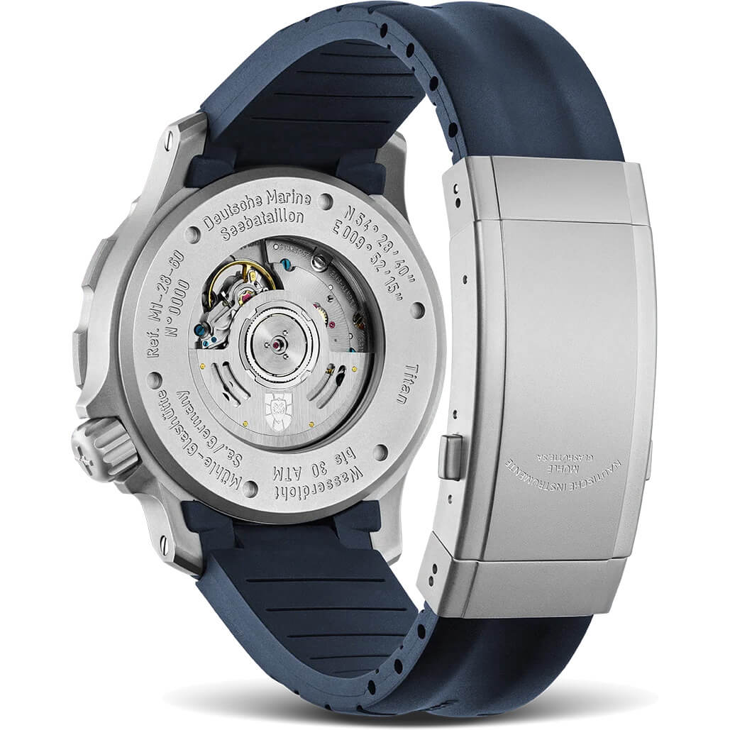 Die Mühle Glashütte S.A.R. Seebataillon mit Titangehäuse erscheint mit blauer Lünette und blauem Zifferblatt. Blaues Kautschukarmband mit Faltschließe aus Edelstahl. Anzeige für GMT/Zweite Zeitzone. Mühle Version Kaliber SW 330-1 mit 42 Stunden Gangreserve.Produktspezifikationen