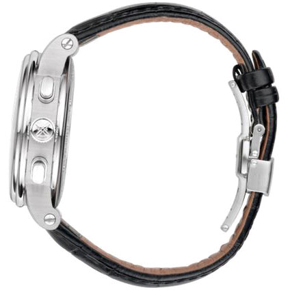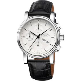 Der Teutonia II Chronograph ist der tickende Beweis dafür, wie man einer eleganten Businessuhr eine sportlichere Richtung geben kann. In erster Linie ist das natürlich ein Verdienst der Zeitnahmefunktion. Denn die Totalisatoren des Stunden- und Minutenzählers verleihen dem Zifferblatt in Silber oder Nachtblau eine ganz eigene Dynamik. Auf das gleiche Konto zahlen auch die schräg angeordneten Anzeigen für das Datum und den Wochentag ein. MU 9413 Automatikwerk mit 48 Stunden Gangreserve. Silberfarbenes, guillochiertes Zifferblatt. Krokolederarmband mit Doppelfaltschließe aus Edelstahl.Produktspezifikationen