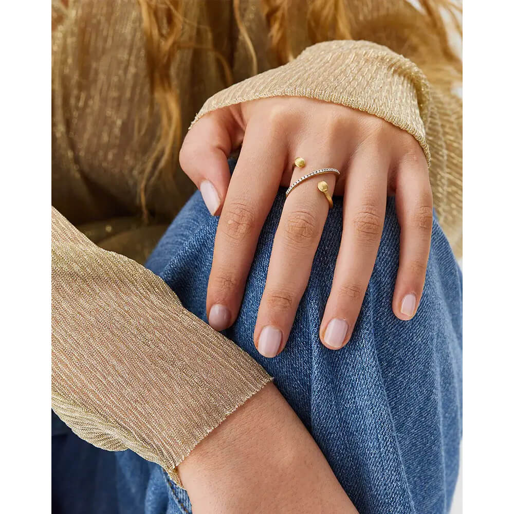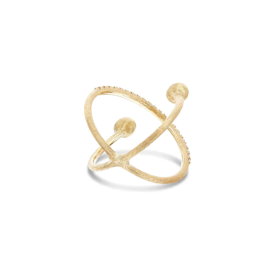 Ein Tribut an die Eleganz, das Konventionen herausfordert und Formen sowie Details mit Raffinesse neu gestaltet. Diamanten und 750/- Gelbgold tanzen miteinander in diesem kunstvollen Ring, um den Finger sanft zu umfassen und ihn zum Leuchten zu bringen.Produktspezifikationen