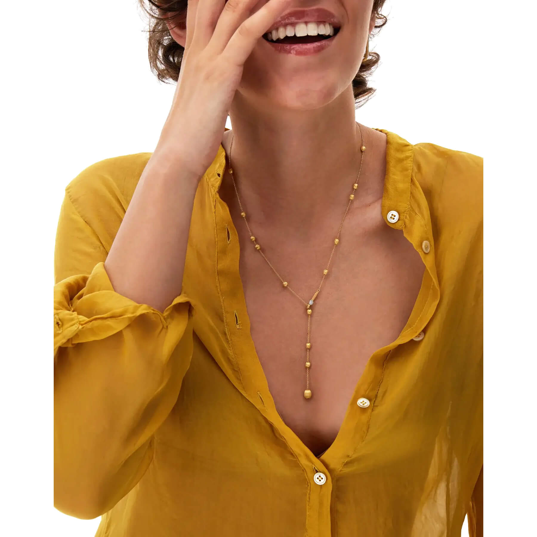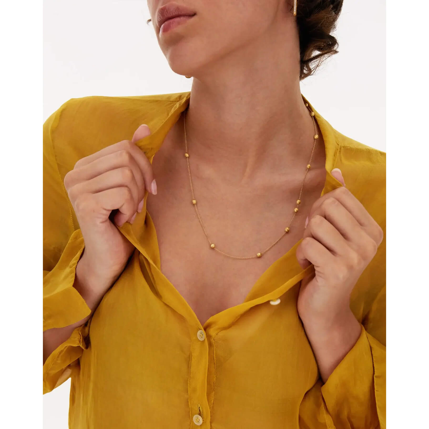 Kugeln aus 750/- Gold bilden das Herzstück dieser frischen, modernen Kette, die sich durch ihre unverwechselbare Vielseitigkeit auszeichnet. Der raffinierte Hakenverschluss, verziert mit feinen Diamanten, vereint Ästhetik und Funktionalität. Er öffnet und schließt sich sanft wie eine Feder und erlaubt es, die Kette auf vielfältige Weise anzupassen und zu tragen. Ihr könnt zwischen einer sanfteren und klassischeren Variante wählen, bei der der Verschluss an einer der Endkugeln befestigt wird, oder einer unkonventionellen, enger am Hals sitzenden Version. Ein vielseitiges und leichtes Schmuckstück, das sich perfekt an jede eurer Facetten anpasst!Produktspezifikationen