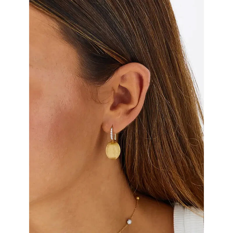 Diese eleganten Ohrringe aus Gelbgold und Diamanten begeistern mit ihrer unregelmäßigen, von Hand mit einem speziellen Stichel gravierten Oberfläche. Das Zusammenspiel von Gold und Diamanten erzeugt ein faszinierendes Lichtspiel, das sowohl zu einem schicken als auch zu einem legeren Outfit passt.Produktspezifikationen