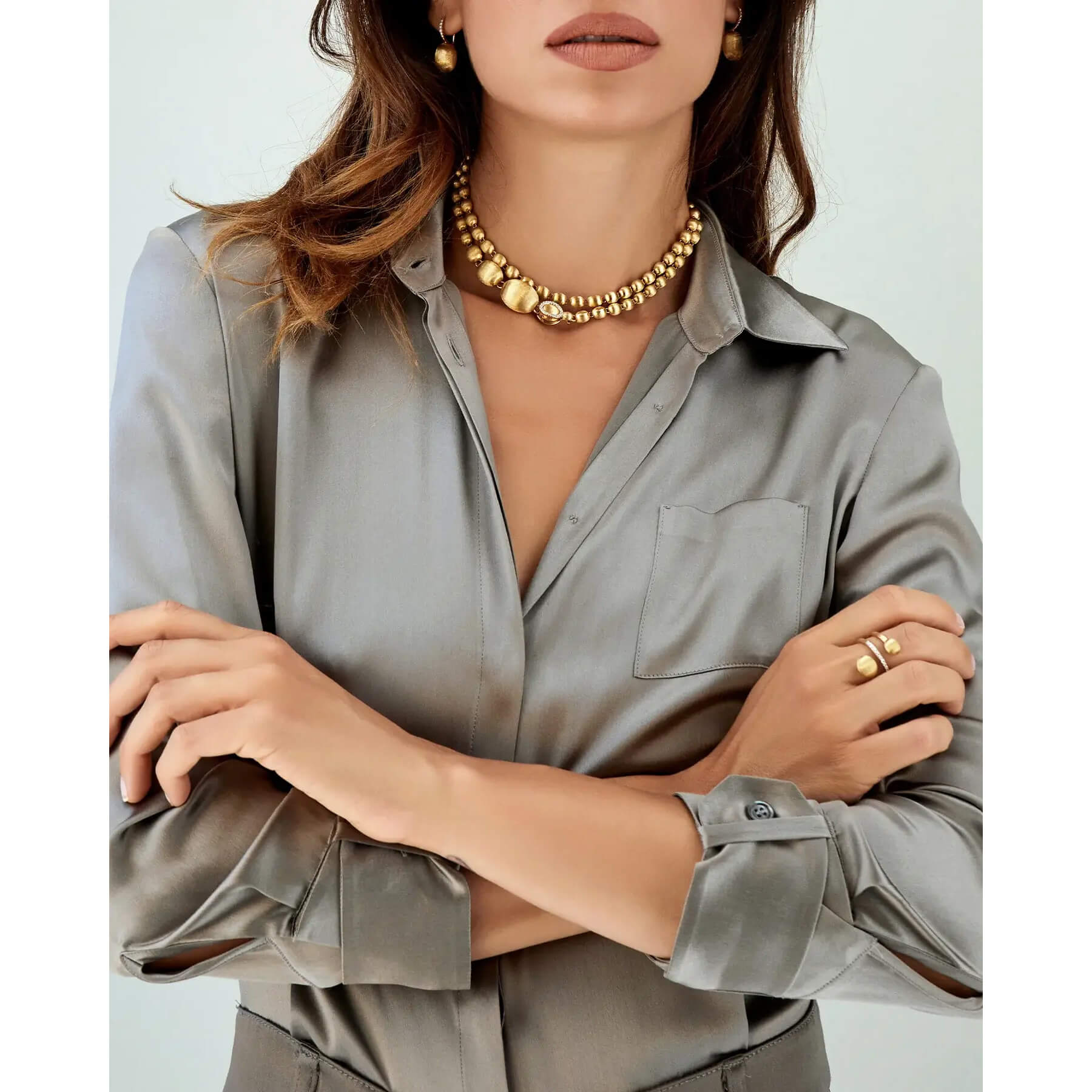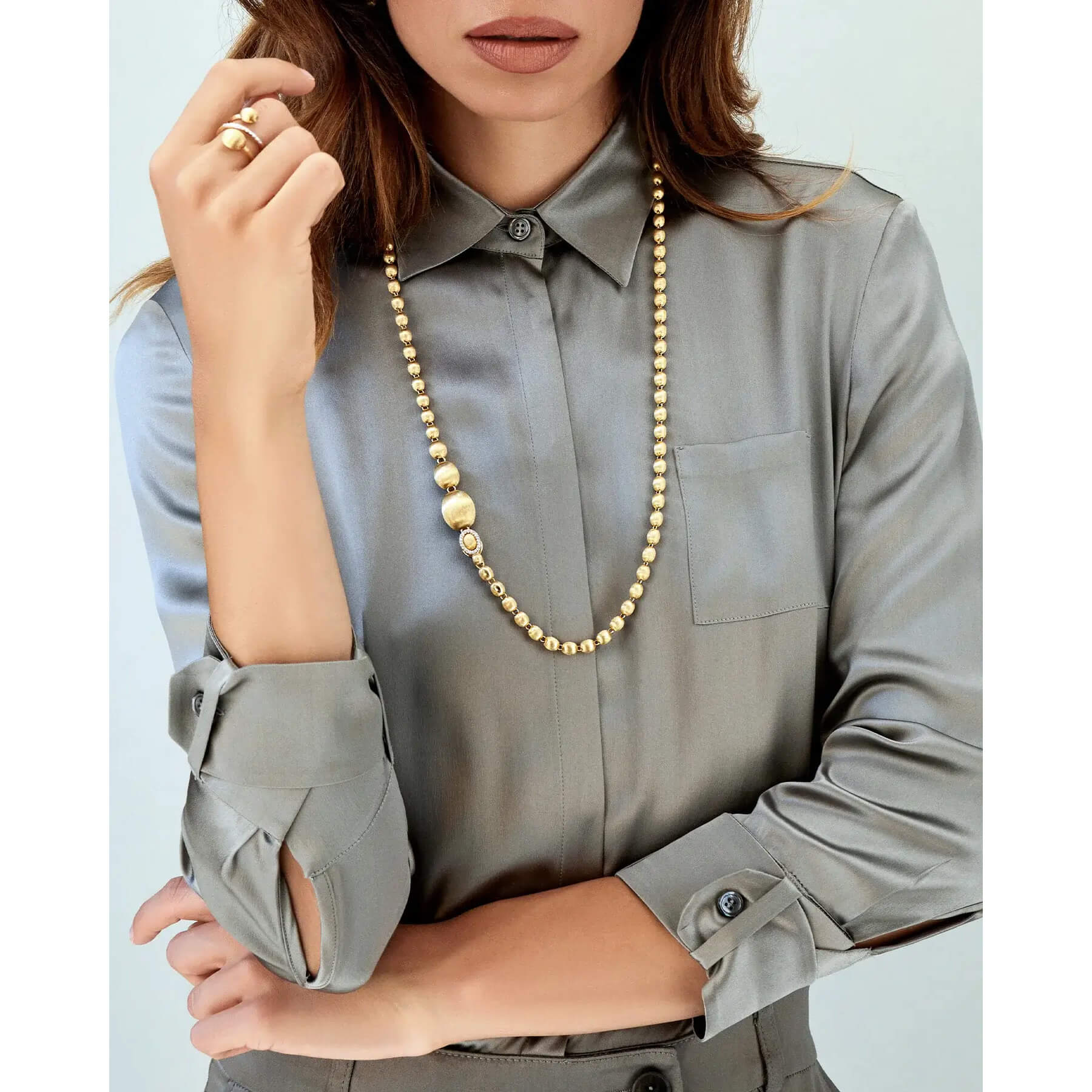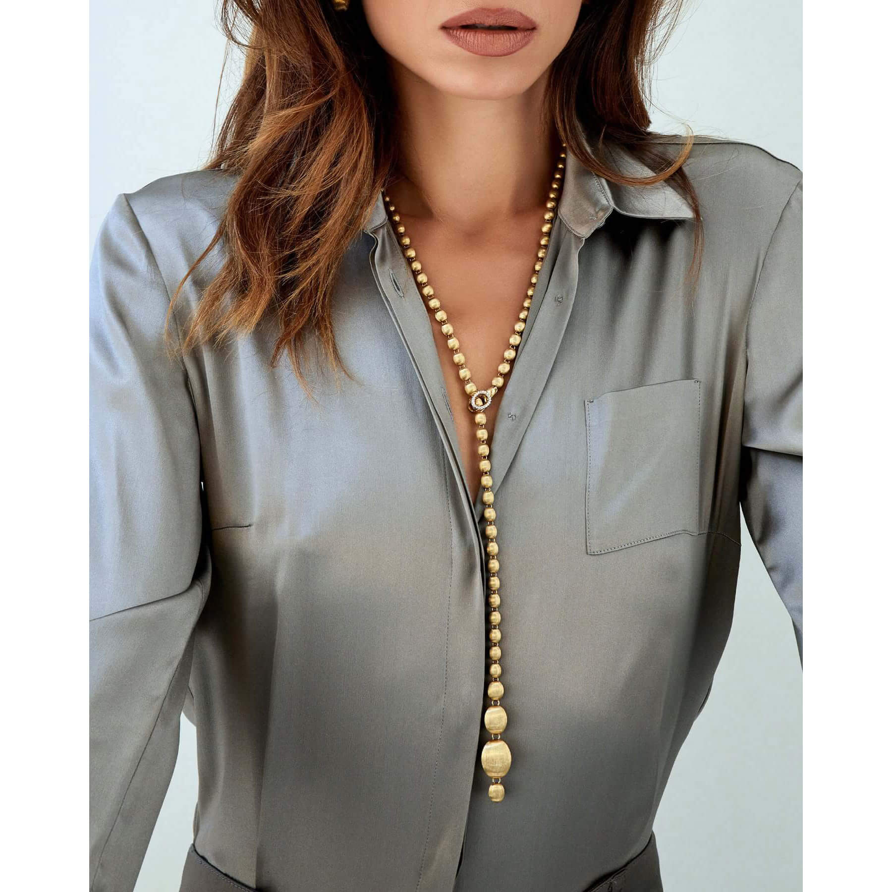 So präsentiert Nanis eine Perlenkette: Kugeln aus 750/- Gold, von Hand graviert, die in einem Verschluss aus Brillanten enden. Dieser Verschluss ist bereit, jede einzelne Kugel dieses Schmuckstücks zu umarmen und öffnet somit die Tür zu unendlichen Möglichkeiten. Denn dieser Goldperlenstrang kann als sinnlicher Choker, klassische Chanel-Variante oder unkonventioneller Lariat getragen werden. Interpretieren Sie ihn ganz nach Ihrem Look und Ihrer Persönlichkeit!Produktspezifikationen