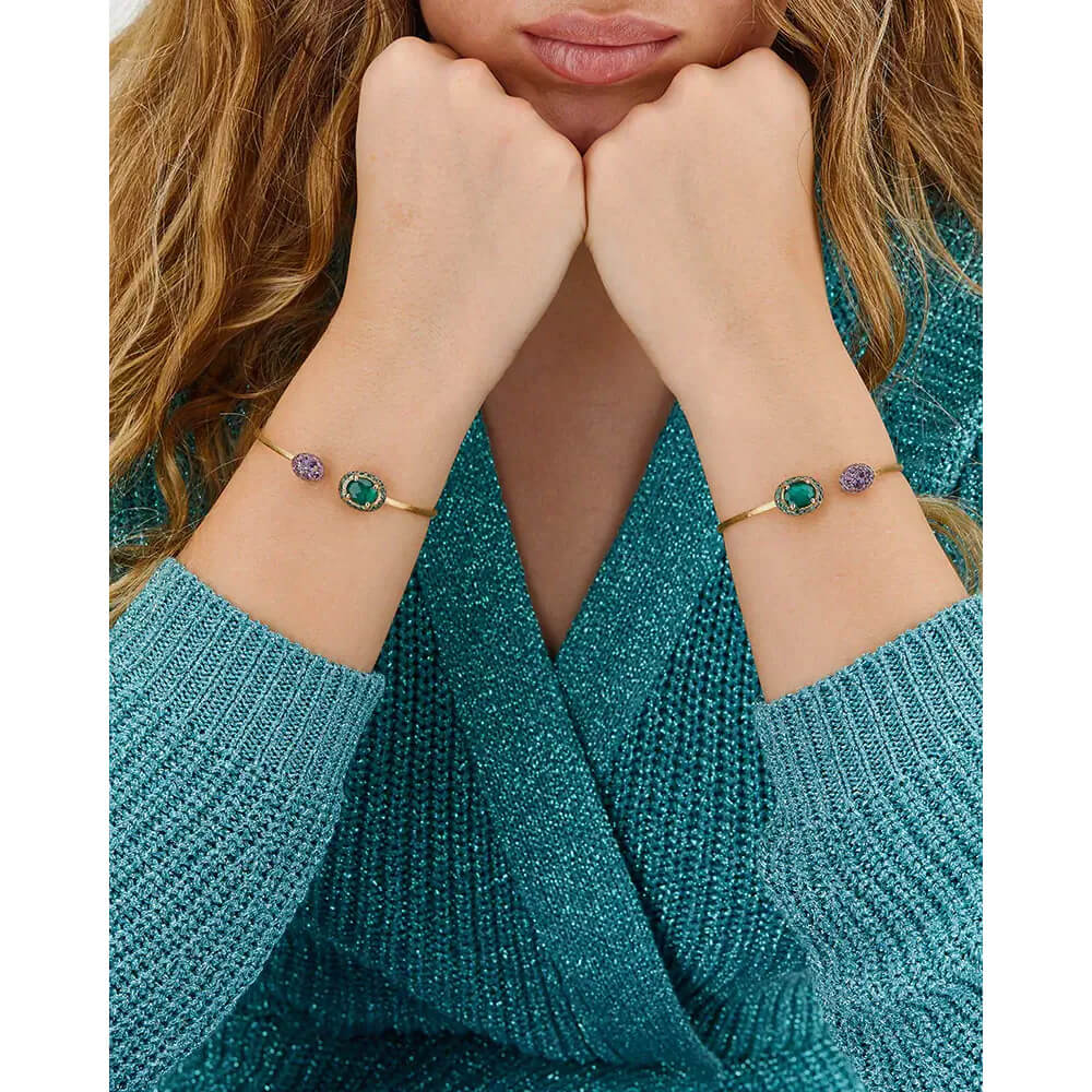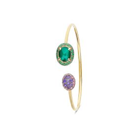 Dieses Band aus 750/- Gold wird von einer Reihe Amethyst, Saphiren und Tsavoriten geschmückt, die sich harmonisch aneinanderreihen. Die unerwartete Leichtigkeit des Bandes verleiht ihm einen zarten und leuchtenden Glanz, während es sich sanft um das Handgelenk schmiegt.Produktspezifikationen