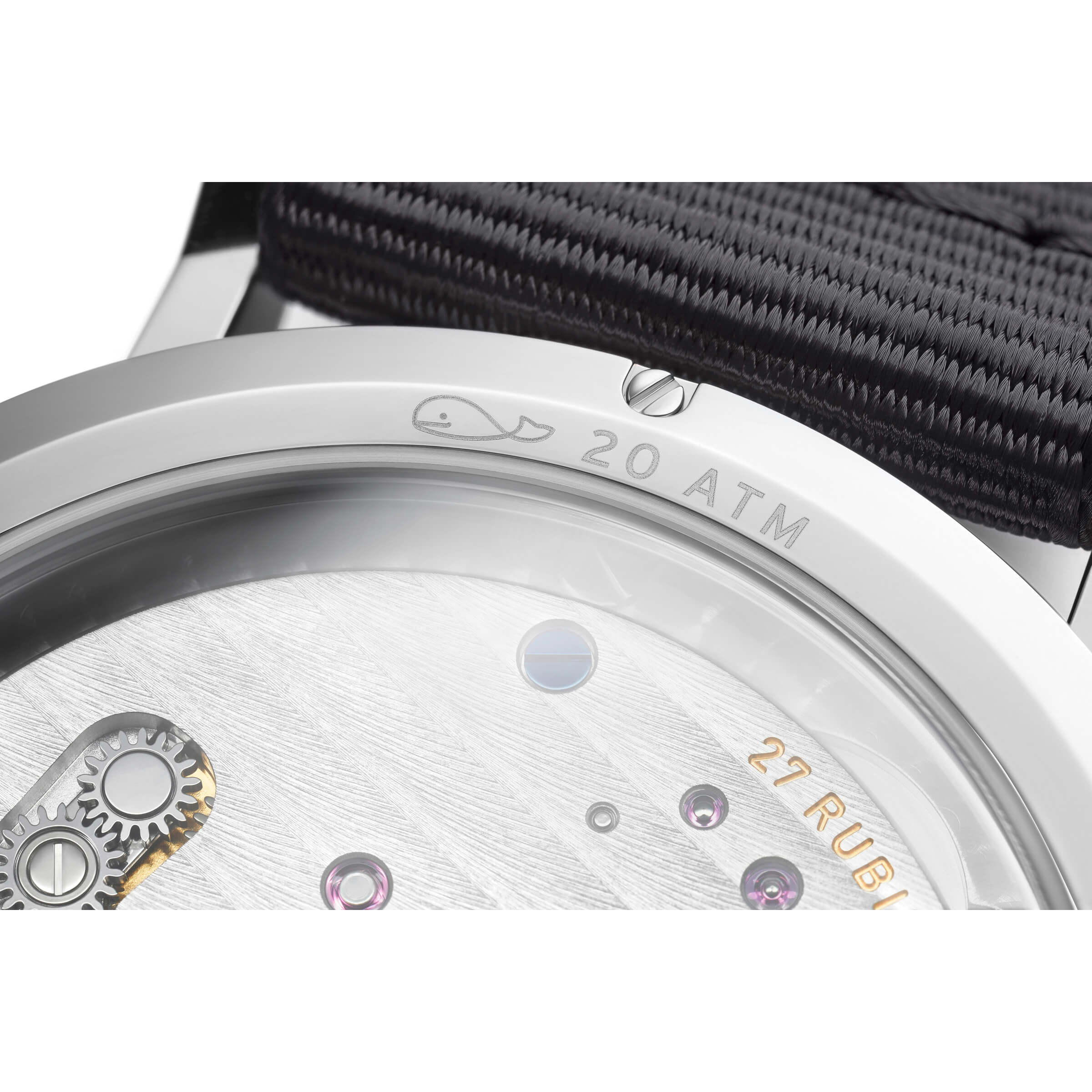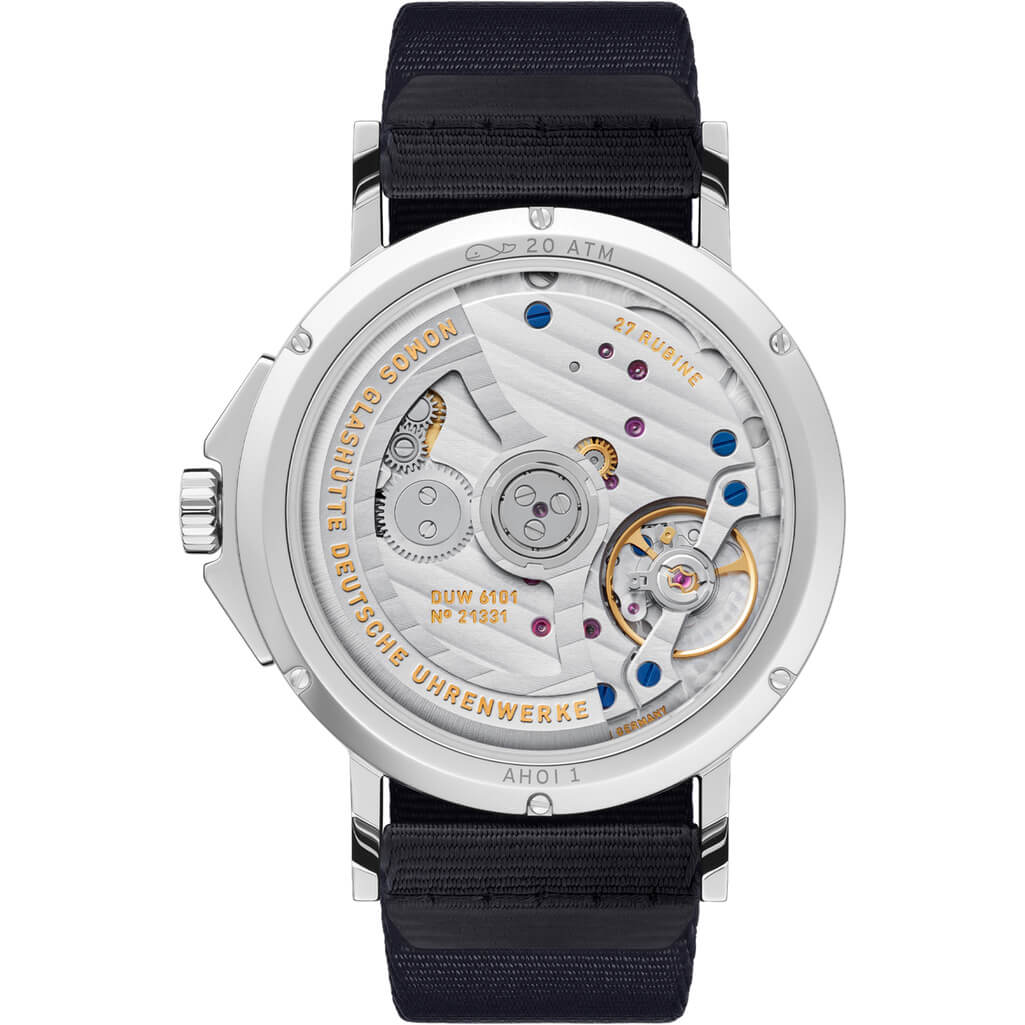 Diese Uhr beeindruckt in vielerlei Hinsicht. Sie ist nicht nur äußerst funktional, sondern auch perfekt auf das Handgelenk abgestimmt. Die wasserdichte Ahoi ist jetzt in einer kompakten Größe von nur 38,5 Millimetern erhältlich und verfügt erstmals über das innovative und extrem flache neomatik-Kaliber DUW 6101 mit einem patentierten Datumsmechanismus. Selbst mit einem Saphirglasboden beträgt die Gehäusehöhe nur schlanke 9,9 Millimeter. Dies verleiht der Uhr eine elegante Sportlichkeit, die ihresgleichen sucht. Darüber hinaus bietet sie ein entspannendes Erlebnis – sei es beim Blick auf das Meer oder beim Genuss eines Sundowners auf der Dachterrasse. All dies geschieht ganz automatisch, wenn man auf das Zifferblatt schaut.Produktspezifikationen