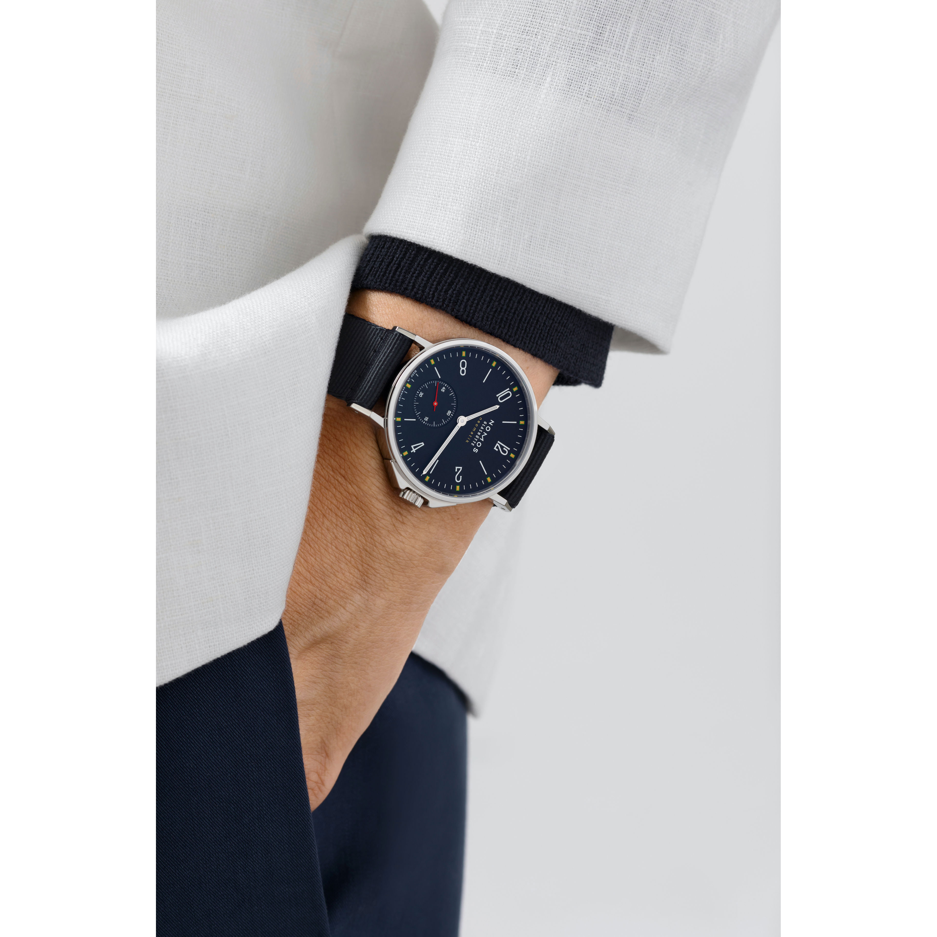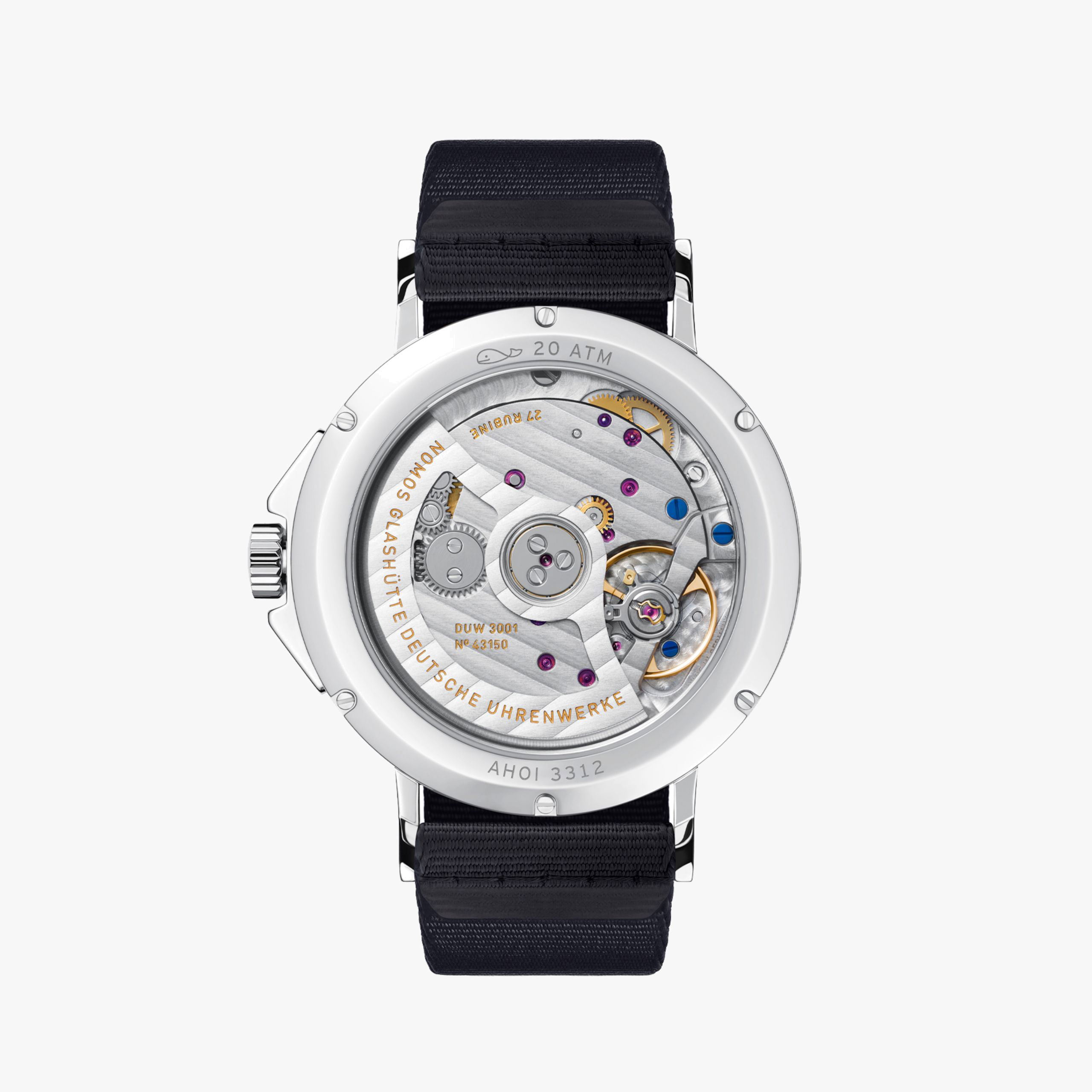 Ahoi neomatik Atlantik – eine vielseitige Automatikuhr, ausgestattet mit der innovativen Kalibertechnologie des hochpräzisen neomatik-Werks DUW 3001. Das von NOMOS entwickelte Uhrwerk misst nur 3,2 Millimeter in der Höhe – so viel wie neun übereinanderliegende Briefmarken – und ist damit ausgesprochen schlank. Getaktet wird die Zeit von einem Assortiment aus eigener Manufaktur, dem berühmten NOMOS-Swing-System. Mit einem Gehäusedurchmesser von 36 Millimetern ist Ahoi neomatik Atlantik das kleinste Modell aus der Ahoi Atlantik-Edition. Die Uhr ist bis 20 atm wasserdicht.Produktspezifikationen