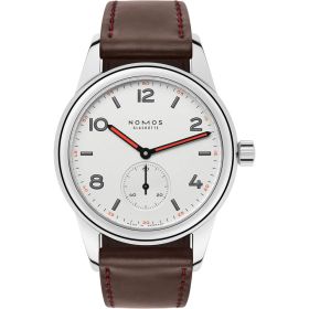 Sportlich, jung und unkonventionell: Der Club nimmt Zuneigungsbekundungen (und andere Erschütterungen) gelassen hin. Sein Edelstahlgehäuse und das Saphirglas bieten robusten Schutz - hier kann nichts passieren. Die markanten Zeiger ziehen selbstbewusst ihre Kreise auf dem weiß versilberten Zifferblatt. Und das NOMOS-Manufakturkaliber Alpha garantiert höchste Präzision.Produktspezifikationen