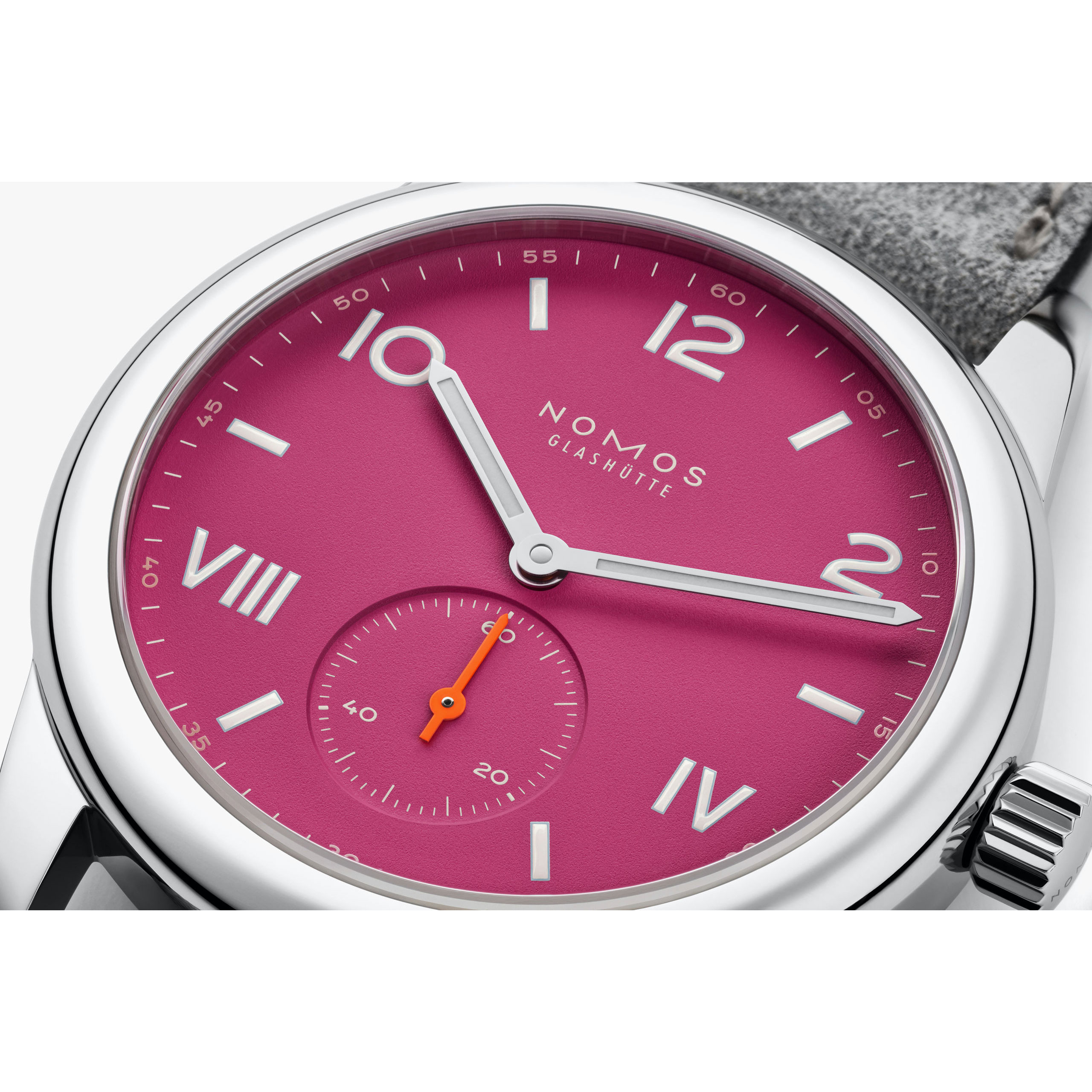 Eine Uhr für viele Gelegenheiten. Club Campus deep pink hat ein robustes, hochglänzend poliertes Stahlgehäuse mit breiter Lünette und ist bis 100 Meter wasserdicht. Mit Superluminova ausgelegte Ziffern, Zeiger und Stundenindexe leuchten in der Dunkelheit und unter Wasser blau nach. Abwechslungsreich und klar ist das Zifferblatt. Minuten- und Sekundenziffern in Weiß erhöhen die Ablesbarkeit, der Sekundenzeiger macht in Neonorange seine Runde. Die Handaufzugsuhr aus Glashütte ist mit dem zuverlässigen NOMOS-Manufakturkaliber Alpha ausgestattet. Deep Pink steht für ein positives Lebensgefühl. Diese Uhr motiviert für die nächsten eigenen Ziele und macht Mut, neue Wege zu gehen.Produktspezifikationen
