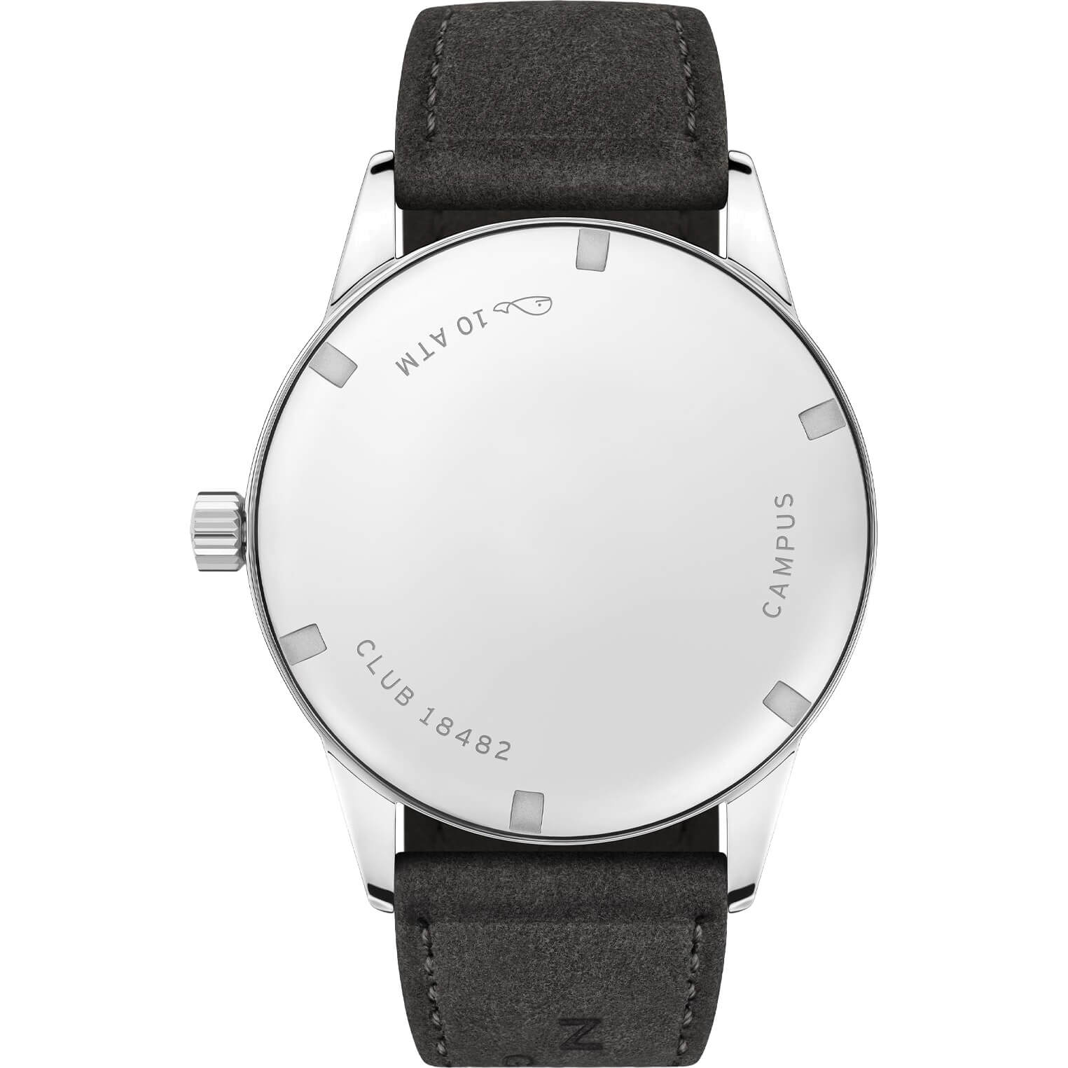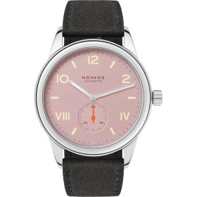 Die Club Campus 38 Full Rose ist eine mechanische Uhr mit ausdrucksstarker Persönlichkeit. Modern, stilvoll und unkompliziert begleitet sie große und kleine Meilensteine – als Zeichen für Erreichtes und für alles, was noch kommt. Mit ihrem Handaufzugswerk aus der NOMOS Manufaktur vereint sie Glashütter Uhrmacherkunst mit einem frischen, zeitgemäßen Design. Das Zifferblatt in kräftigem Rosé zieht sofort die Blicke auf sich. Gelbe Konturen an Stundenmarkierungen und Ziffern sowie hellblaue Minutenziffern verleihen ihm zusätzliche Tiefe und einen spannenden Farbakzent. Typisch für Club Campus kombiniert das Zifferblatt arabische und römische Ziffern – die Vier wird dabei modern als „IV“ dargestellt. Super-LumiNova auf Zeigern und Indizes sorgt auch bei Dunkelheit für optimale Ablesbarkeit. Das anthrazitfarbene Veloursband in veganer Ausführung ergänzt den charakterstarken Look und setzt das farbintensive Modell stilvoll in Szene. Das Edelstahlgehäuse misst 38,5 Millimeter im Durchmesser, ist nur 8,5 Millimeter hoch und damit besonders angenehm zu tragen. Dank einer Wasserdichtigkeit bis 10 atm ist die Club Campus 38 full rose auch zum Schwimmen geeignet.Produktspezifikationen