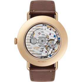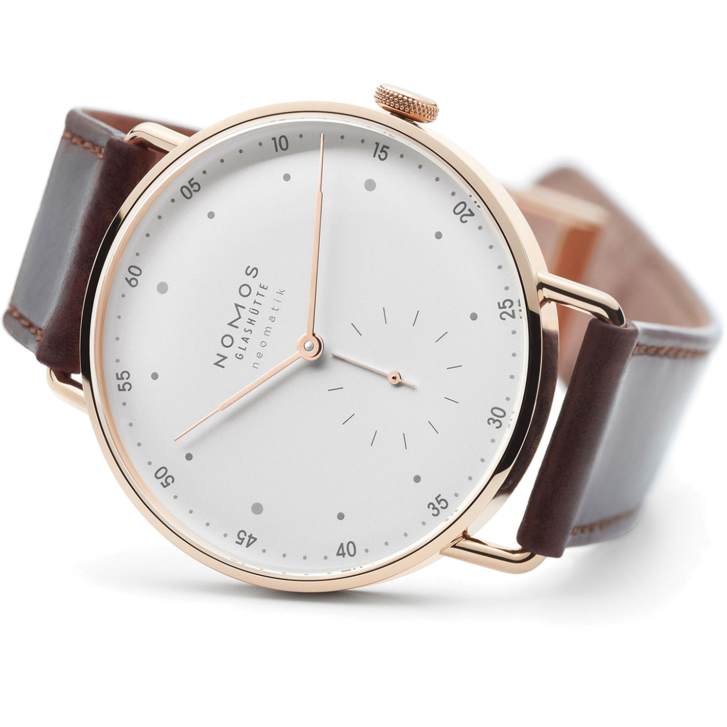 Die Metro Roségold neomatik 39 erscheint mit 18 Karat Roségold Gehäuse mit Unterboden aus Saphirglas. Bei einer Wasserdichtigkeit bis 3 bar (30 Meter) gilt die Uhr als spritzwassergeschützt. Das Zifferblatt erscheint weiß versilbert mit grauen Indizes und vergoldeten Zeigern. Präsentiert wird die Uhr aus der NOMOS Glashütte Manufaktur an einem braunen Armband aus Leder (Horween Genuine Shell Cordovan). Im Herzen des Zeitmessers schlägt das NOMOS Kaliber DUW 3001 neomatik mit Automatikaufzug und einer Gangreserve von ca. 43 Stunden.Produktspezifikationen